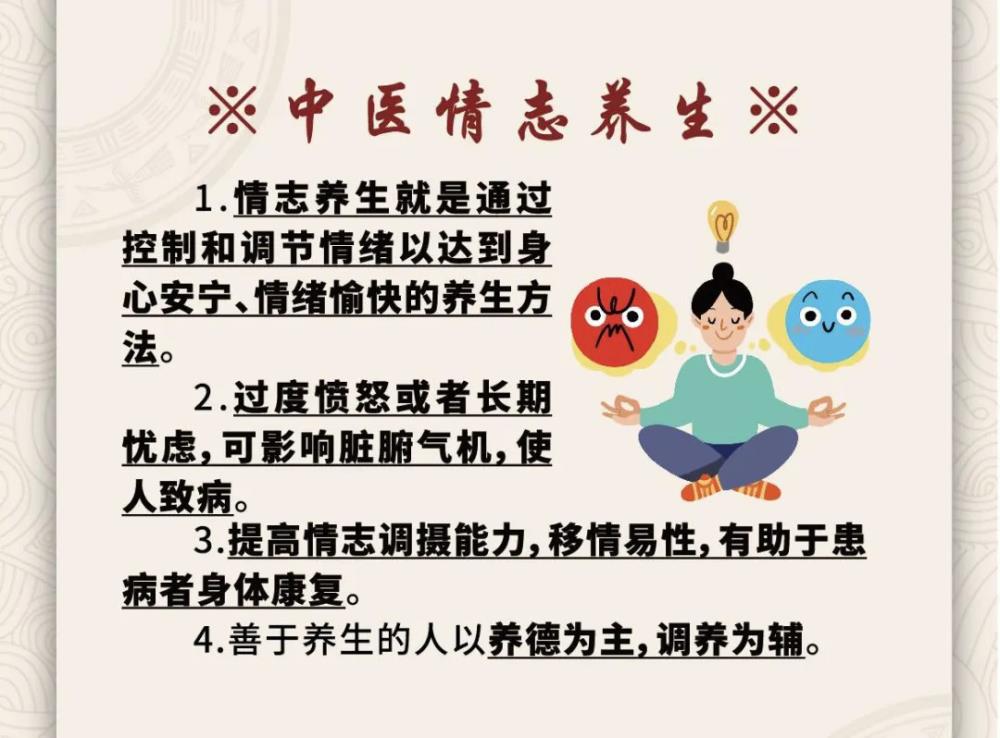 中医认为,人体是一个有机的整体。一旦发生疾病,局部病变可以影响到全身,全身的病变也可以在某些细微的局部反应出来。人的精神意识、思维活动既是心的功能,又与五脏功能密切相关。当各种情志突然、猛烈刺激作用于心神,过激的情志变化使人体功能发生障碍时,人就会生病。形神不一,七情致病。爆发性的精神刺激,如突如其来的惊恐,意料之外的巨大打击或重大收获,难以忍受的伤痛,巨大的事变或灾难等,这些强烈的突发刺激,使人气血逆乱,阴阳乖戾,从而导致一些暴病、急病的发生,甚至死亡。渐进的精神疾病,往往是因为某些问题在相当长的一段时间内未获得解决或实现而引起。避免或缓解这些情志问题,可通过情志养生防治。中医养生保健观念认为,情志养生就是通过控制和调节情绪以达到身心安宁、情绪愉快的养生方法。过度愤怒或者长期忧虑,可能影响脏腑气机,使人致病。提高情志调摄能力,移情易性,有助于患病者身体康复。建议日常生活中,精神保持淡泊宁静的状态,保持静养,思想清静,畅达情志,使精气神内守而不散失。情绪不佳时,可以借琴棋书画,转移情志,陶冶性情。提高道德修养,心境高远,不谋私利。 中医药健康文化素养知识点