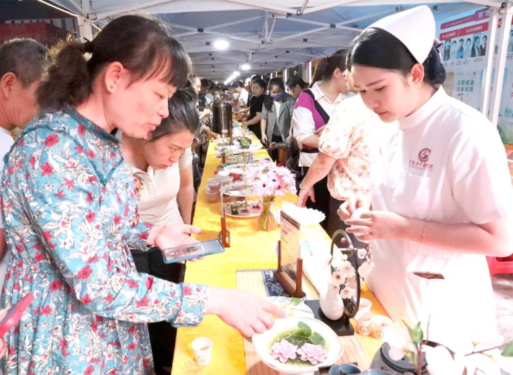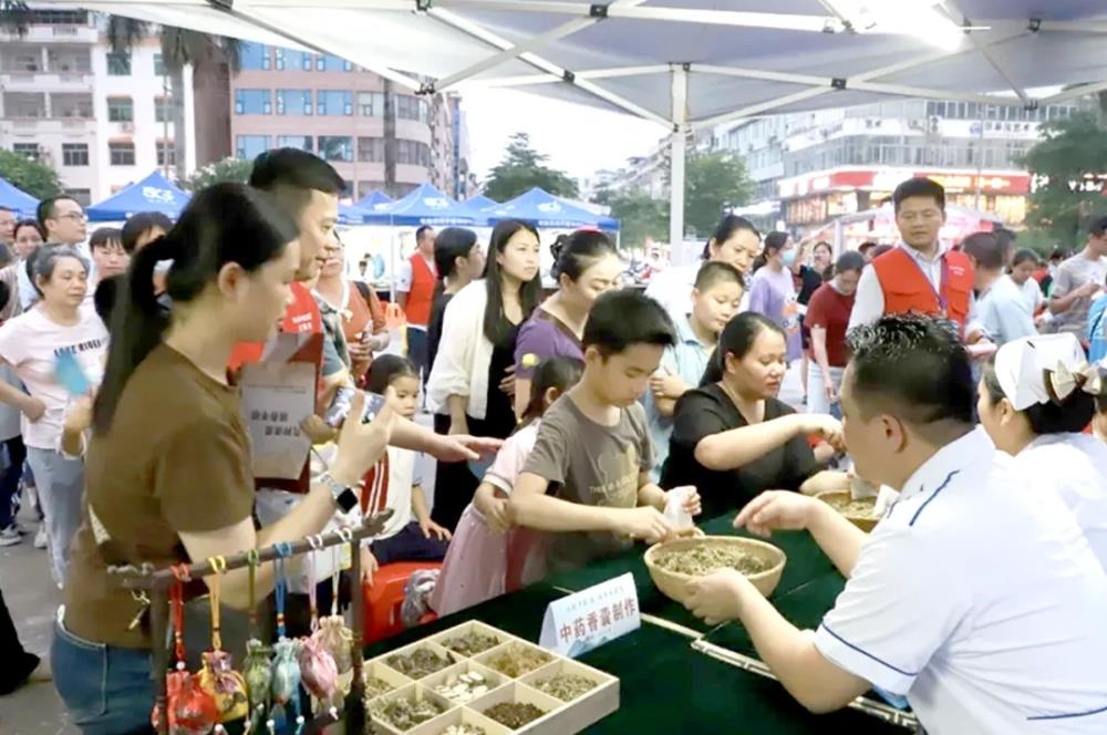 在钦州市灵山县“百市千县”中医药文化惠民活动中,阵阵药膳香气扑鼻而来。时令养生茶、罗汉果茶……在药膳品尝区,民众围在一旁品味着药香四溢的本草茶饮,交流夏日养生心得。养生馒头、马蹄桂花糕等产品供不应求,而融入陈皮、枸杞等药材的“中药奶茶”则成为年轻人的打卡热点。一杯杯兼具养生功效与时尚口感的饮品,让传统中医药与现代饮食文化碰撞出新奇火花,不少民众举杯拍照,直呼“中医药也可以很潮”。专家现场还传授香囊制作技艺,一步步指导民众制作出兼具美观与保健功能的香囊,带领民众领略源远流长、博大精深的中医文化。小小的香囊不仅承载着中医药文化的智慧,更成为民众手中的“健康护身符”。