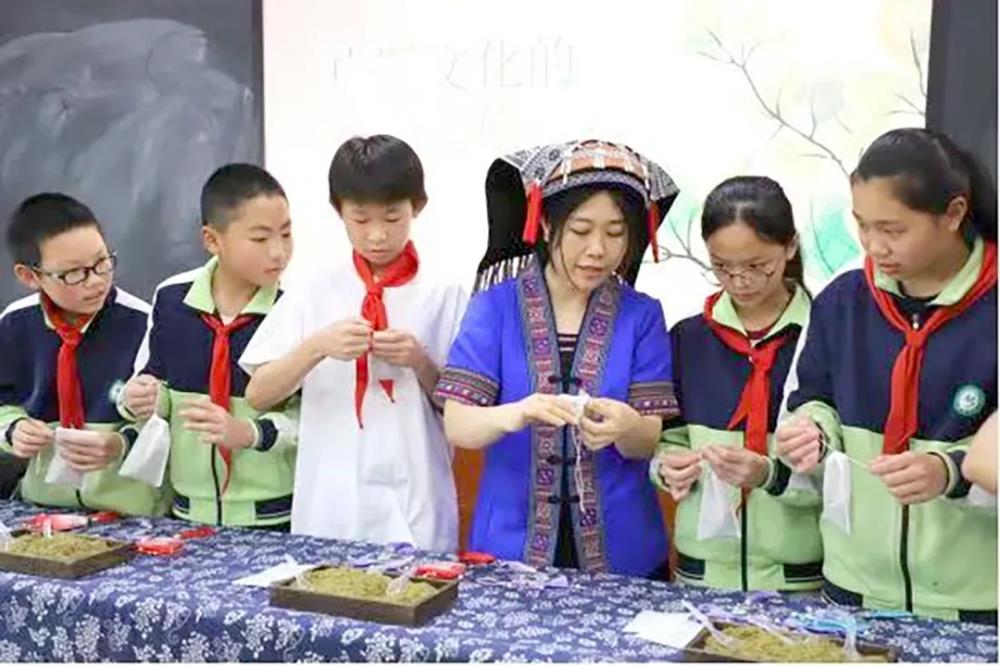 富川瑶族自治县第三小学的孩子们学习制作中药香囊。