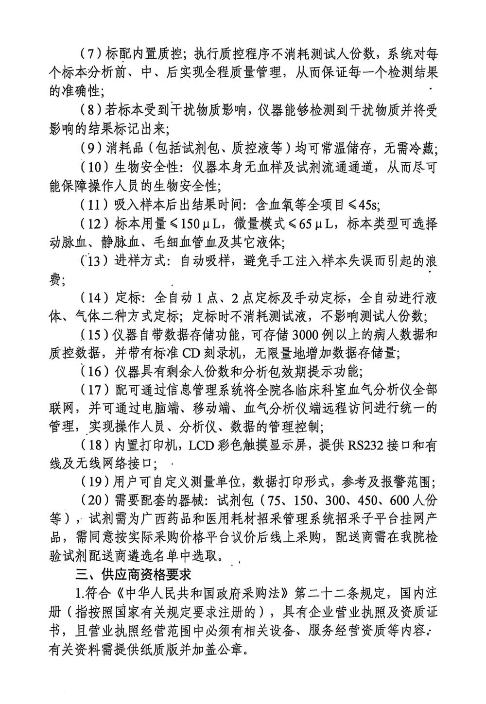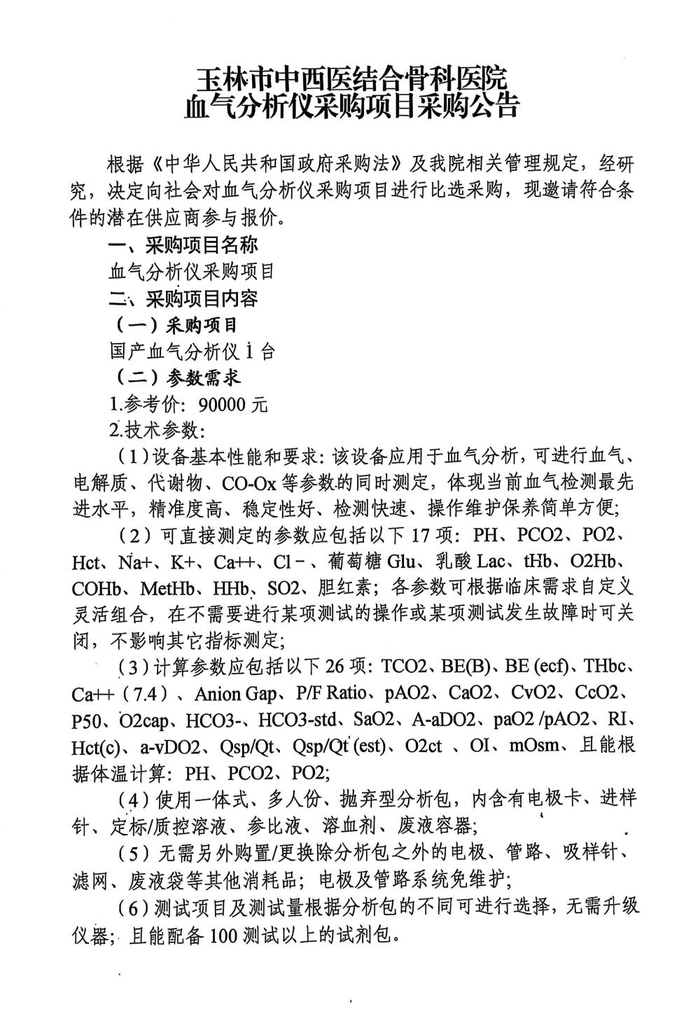 玉林市中西医结合骨科医院血气分析仪采购项目采购公告