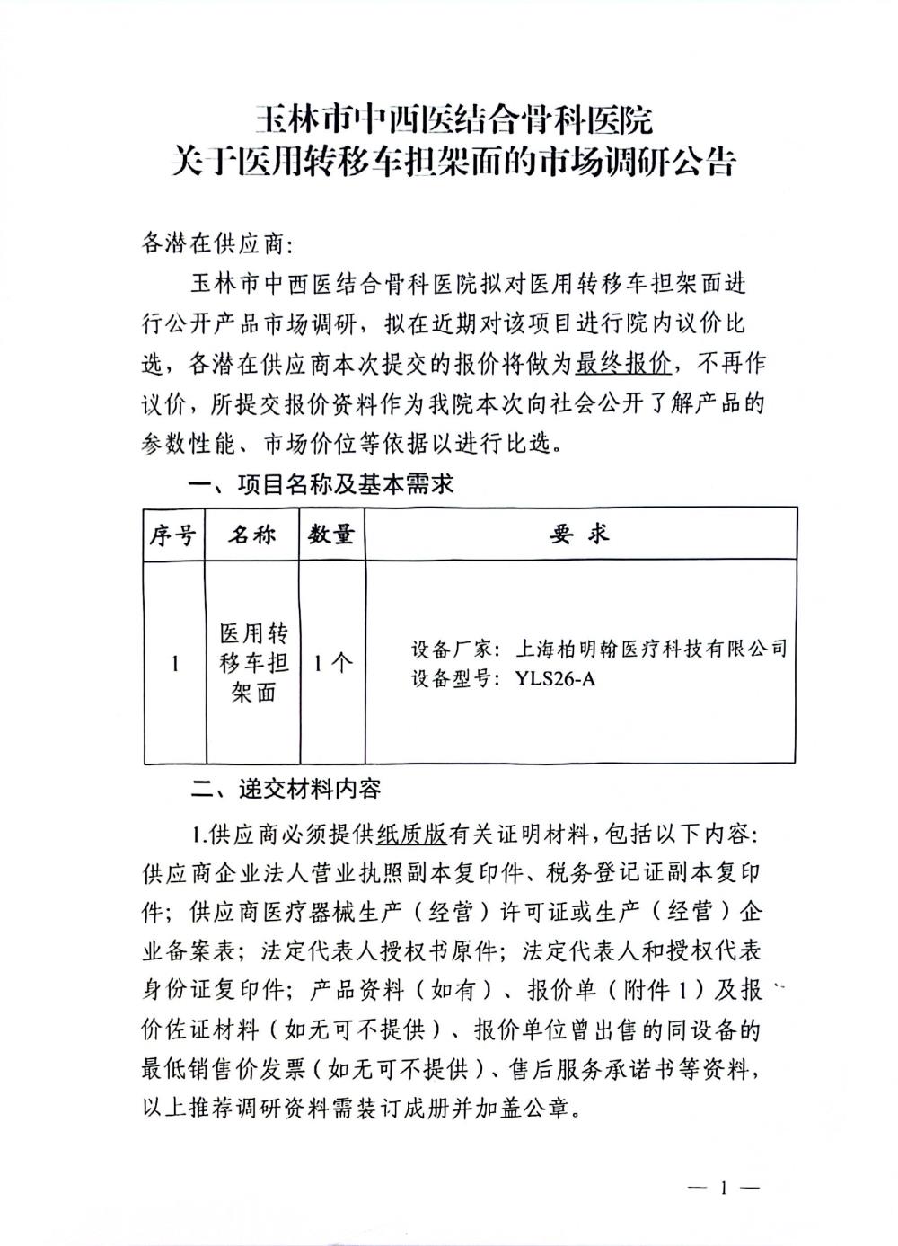 玉林市中西医结合骨科医院关于医用转移车担架面的市场调研公告