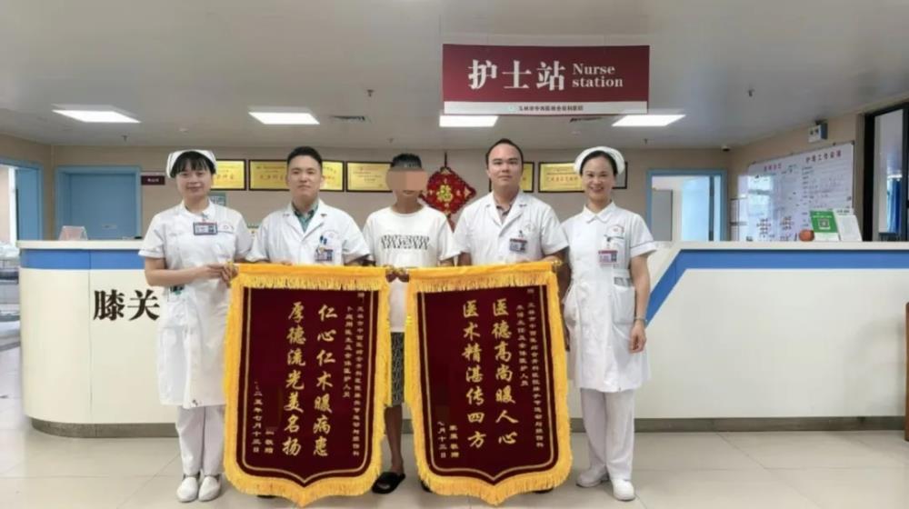 在科室医护人员的精心治疗与照护下,罗某恢复迅速:复查片显示骨折对位对线良好,关节面平整,膝关节疼痛显著缓解,关节活动度大幅改善。久违的笑容终于回到他的脸上:“是玉林市中西医结合骨科医院的专家们,给了我重新站起来的机会!手术技术太强了,感谢朱主任、卜医生和所有医护人员!”