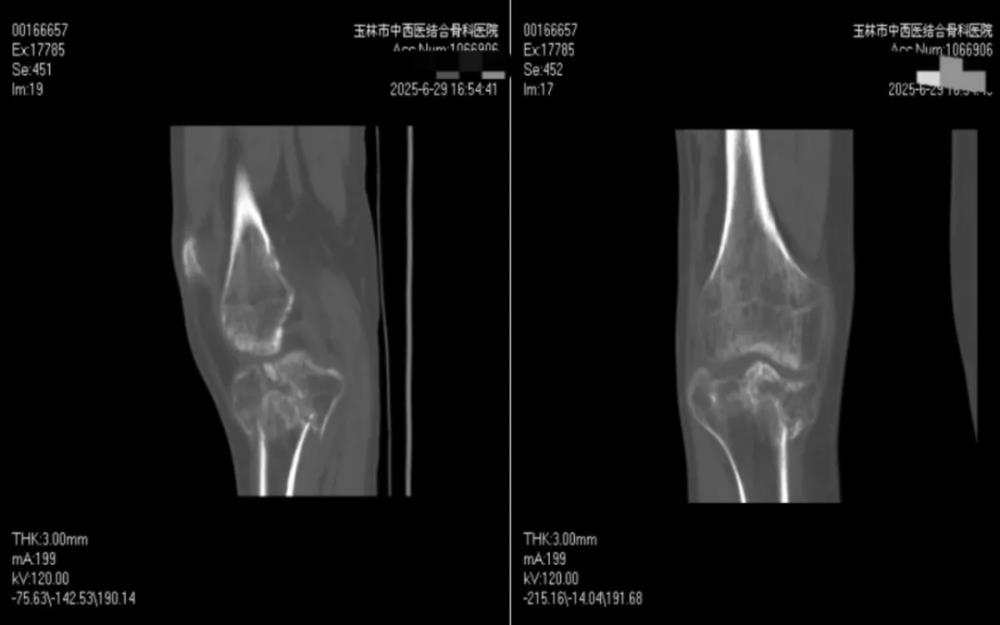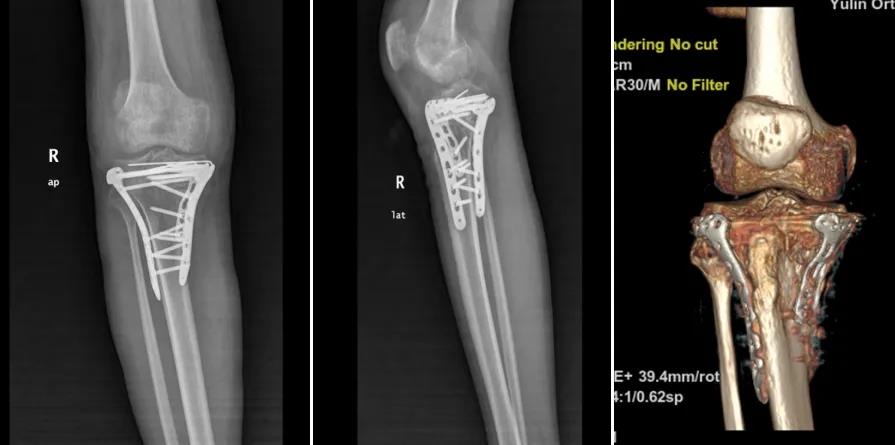 转机出现在亲友的推荐下。罗某抱着一丝希望,跨越三小时路程,从柳州来到玉林市中西医结合骨科医院,慕名求诊于膝关节病与运动损伤科朱博副主任医师。经朱博医师细致检查,确诊为“右胫骨平台陈旧性粉碎性骨折”,骨折端粉碎严重,移位明显,关节面塌陷,且已畸形愈合,手术难度极大。