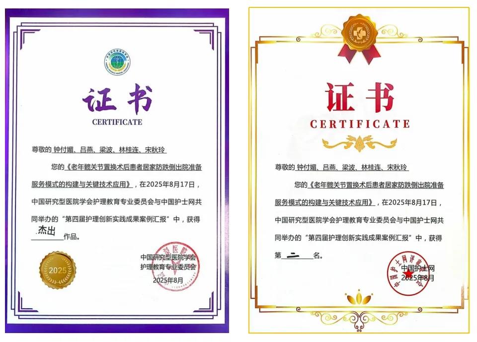 该荣誉既是对团队多年临床创新的肯定,也源于医院领导对护理学科建设与创新发展的重视;未来,医院将构建 “预防 - 干预 - 适应” 全周期数智管理体系,为老年患者提供居家预防跌倒智能化服务,惠及更多老年髋关节置换患者,助力老年护理事业高质量发展。