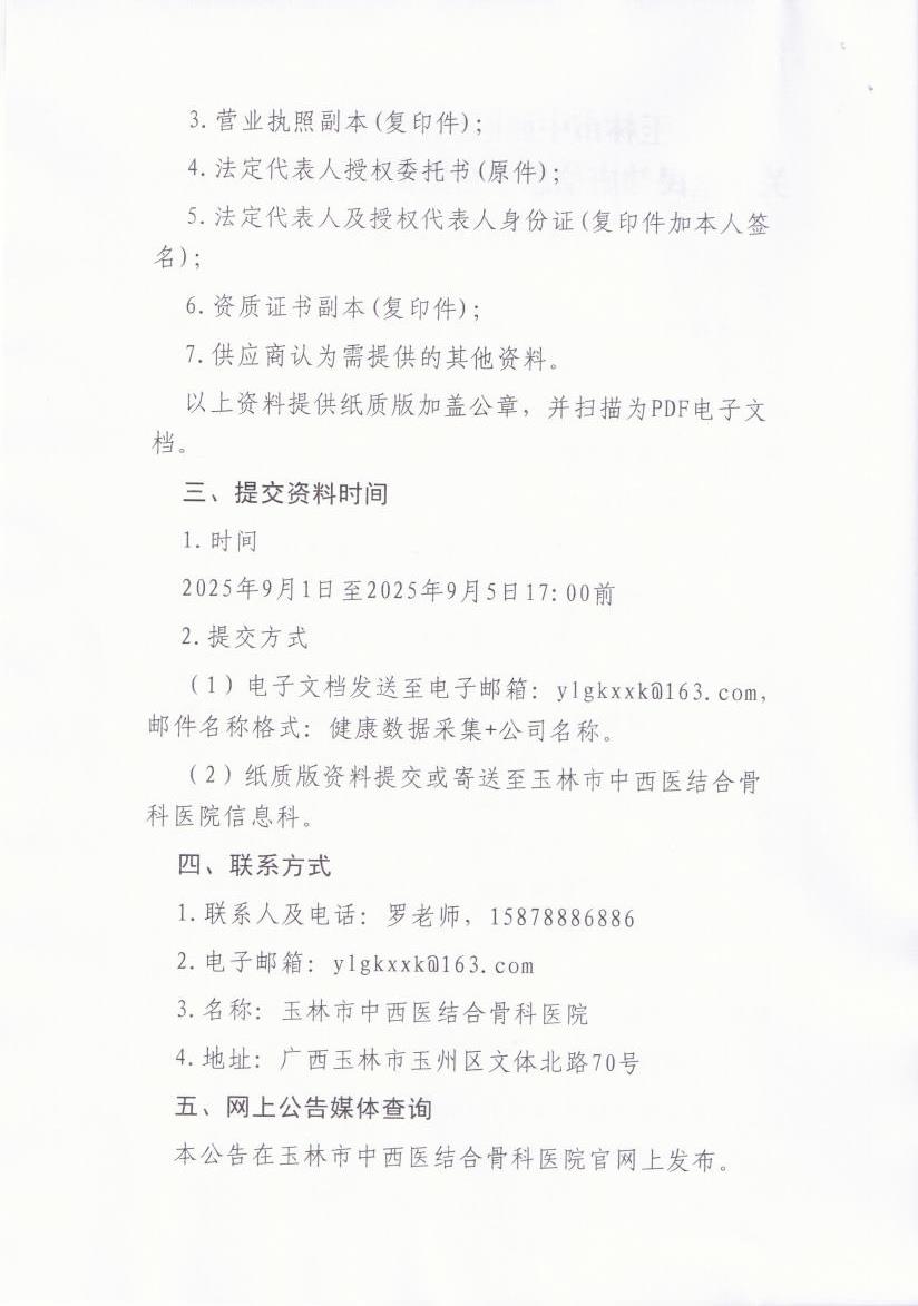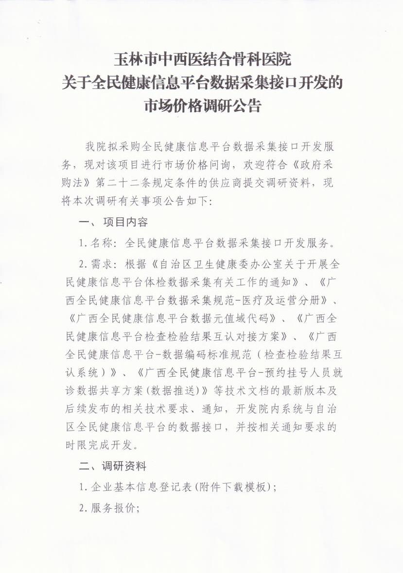 玉林市中西医结合骨科医院关于全民健康信息平台数据采集接口开发的市场价格调研公告