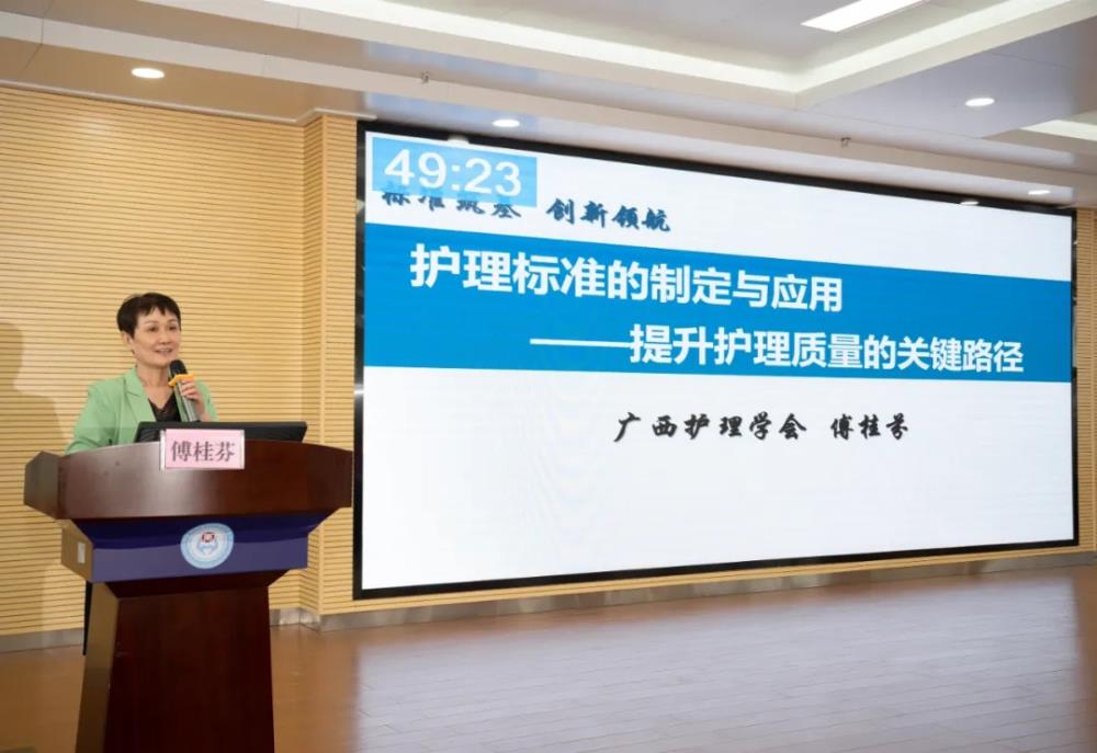 ▲广西护理学会理事长傅桂芬教授讲授“护理标准的制定与应用——提升护理质量的关键路径”