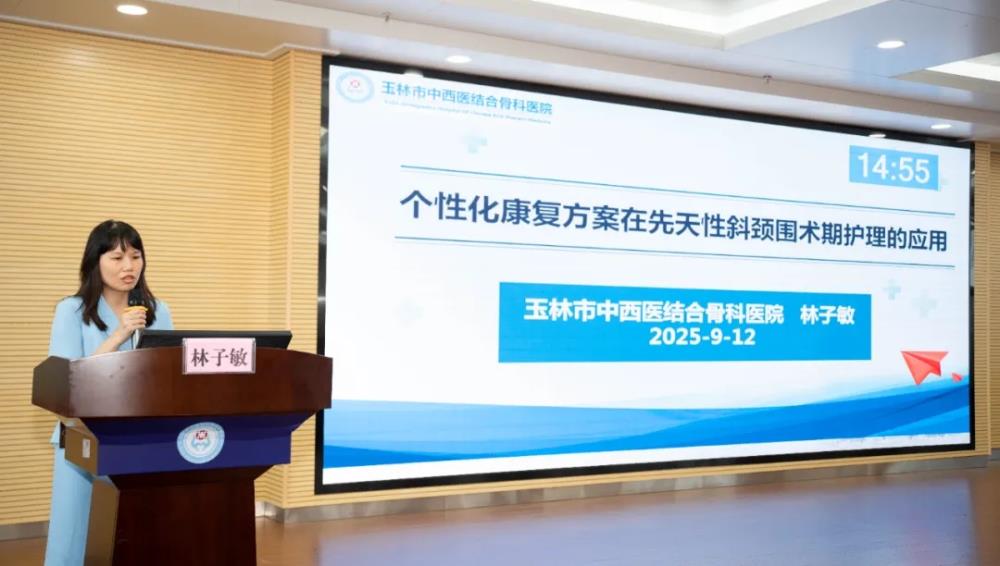 ▲玉林市中西医结合骨科医院林子敏副主任护师讲授“个性化康复方案在先天性斜颈围术期护理的应用”
