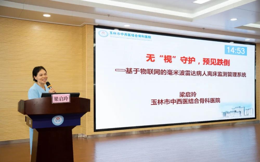 ▲玉林市中西医结合骨科医院梁启玲主任护师讲授“无”视"守护,预见跌倒——一种基于物联网的毫米波雷达病人离床监测管理系统”