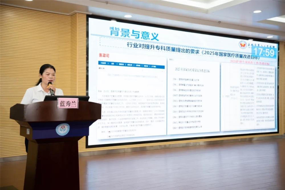 ▲玉林市第二人民医院蓝秀兰副主任护师讲授“基于骨科单病种管理的人工髋关节置换术专科护理敏感指标的构建与应用”