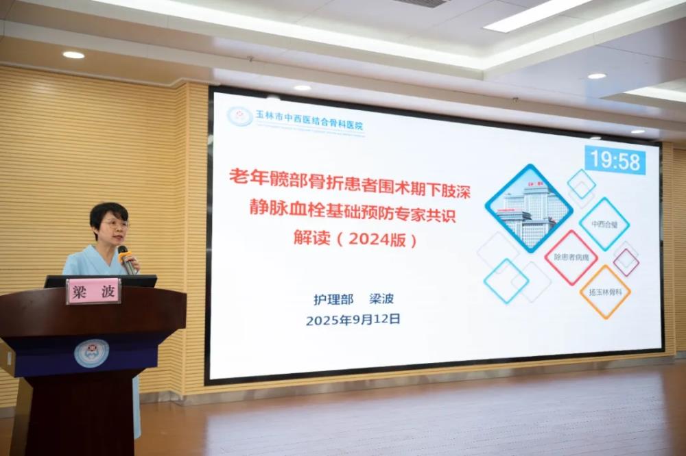 ▲玉林市中西医结合骨科医院梁波主任护师讲授“老年髋部骨折患者围术期下肢深静脉血栓基础预防专家共识解读(2024版)”