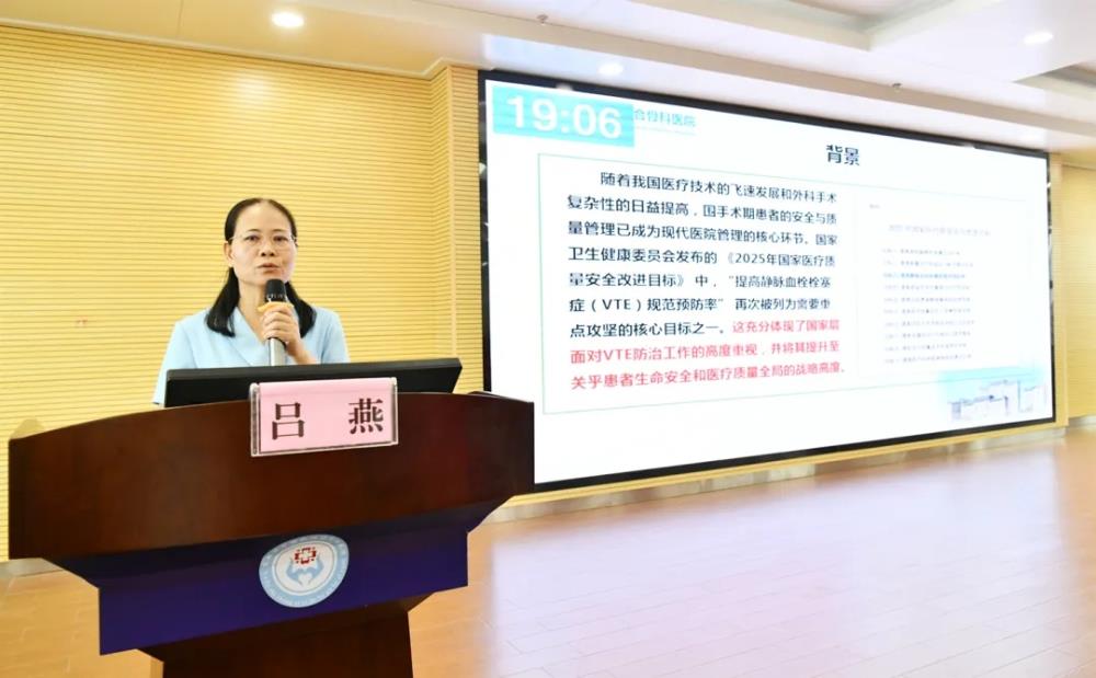 ▲玉林市中西医结合骨科医院吕燕副主任护师讲授“围手术期静脉血栓栓塞症预防与护理策略”