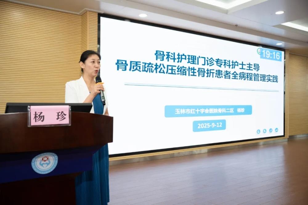 ▲玉林市红十字会医院杨珍主任护师讲授“骨科护理门诊专科护士主导骨质疏松压缩性骨折患者全病程管理实践”