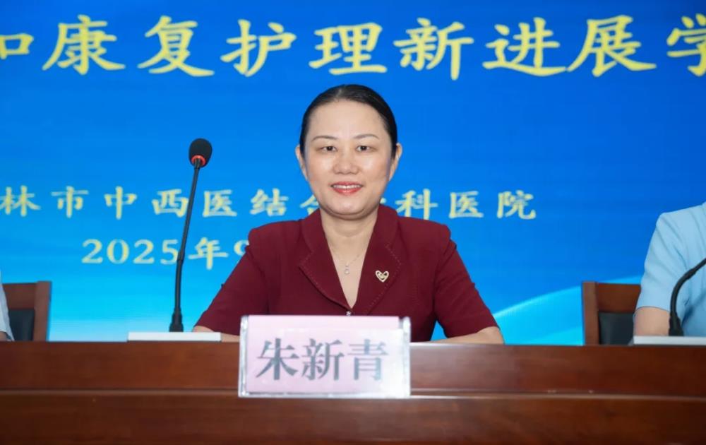 玉林市护理学会理事长朱新青在讲话中指出,玉林市中西医结合骨科医院给予了本次学习班大力支持,为玉林市骨科护理同仁搭建学术交流平台,感谢各医院护理同仁的支持与专家精心备课分享经验。她指出,随着人民群众健康需求增长,骨科康复护理面临机遇与挑战。现代信息化、数字化发展、先进3D打印技术融入,且服务延伸至社区与家庭,为患者提高了生命与生活的优质服务质量,其中玉林市中西医结合骨科医院就是一个学习典范。最后,预祝学习培训班圆满成功,祝学员学习愉快!