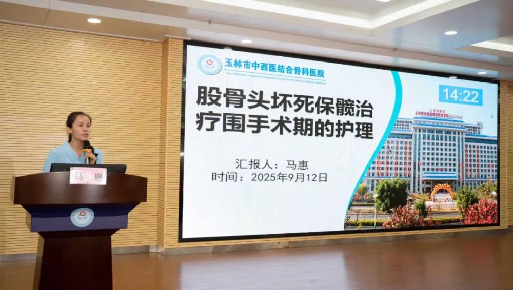 ▲玉林市中西医结合骨科医院马惠主管护师讲授“股骨头坏死保髋治疗围手术期的护理”