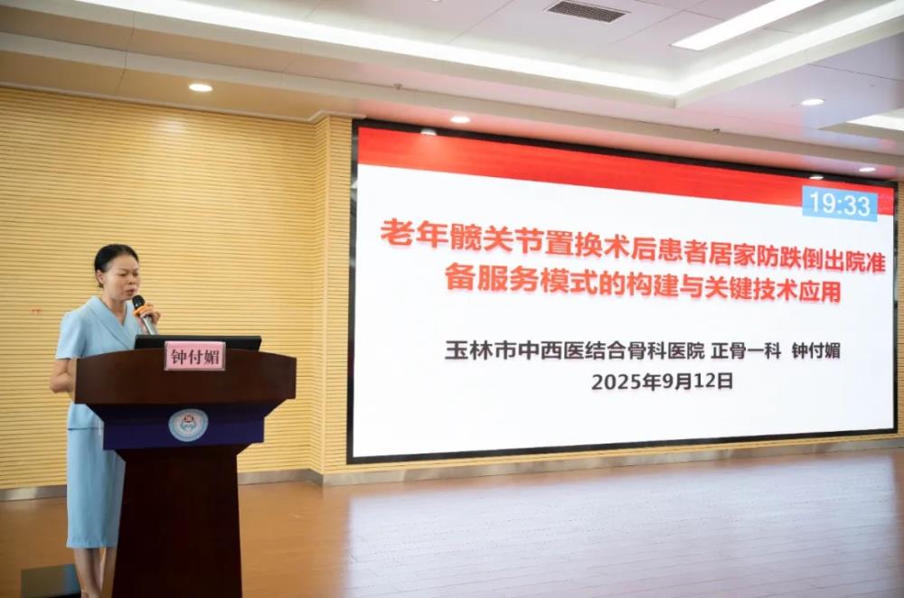 ▲玉林市中西医结合骨科医院钟付媚副主任护师讲授“老年髋关节置换术后患者居家防跌倒出院准备服务模式的构建与关键技术应用”