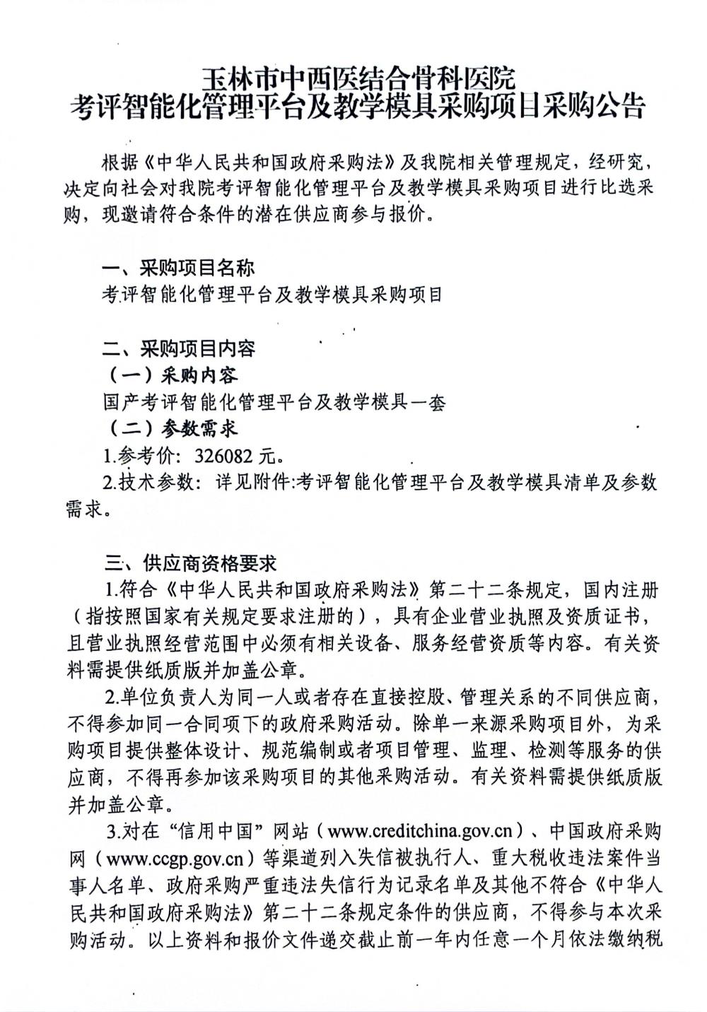 玉林市中西医结合骨科医院考评智能化管理平台及教学模具采购项目采购公告