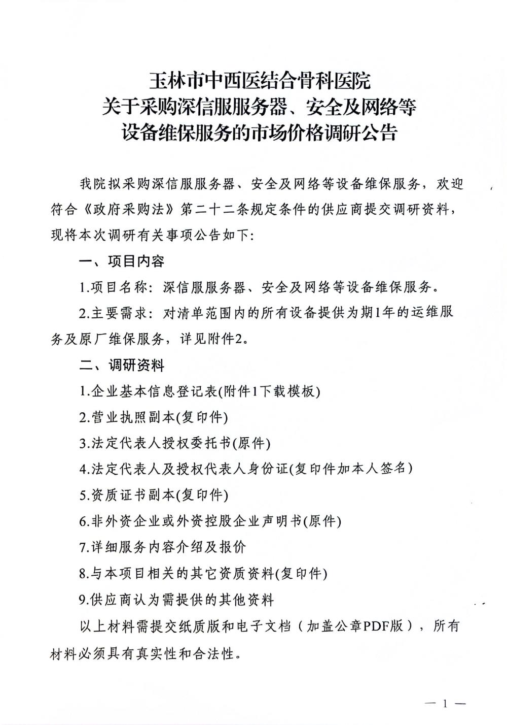 玉林市中西医结合骨科医院关于采购深信服服务器、安全及网络等设备维保服务的市场价格调研公告
