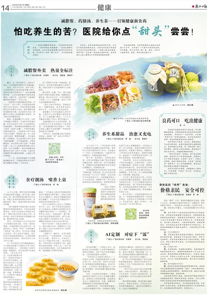 在广西中医药大学附属瑞康医院,不少患者来药膳门诊请医生开具个性化的治疗药膳处方。一旁的便民门诊同样热闹,药膳汤包、养生茶包等产品备受青睐。“药材各有所长,对症使用能事半功倍。”该院药学部副主任中药师刘偲翔说。医院还为食品生产企业提供技术支撑,企业根据医院提供的配方推出药食同源果冻、红糖、奶糕、米通、方便粥等产品,让更多的人感受药食同源的魅力。