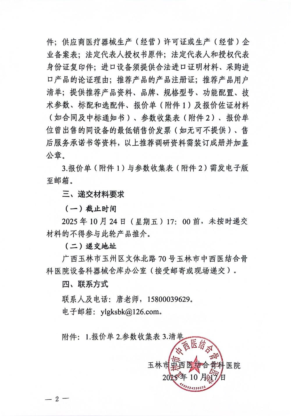 玉林市中西医结合骨科医院关于脊柱椎间孔镜微创手术器械的市场调研公告