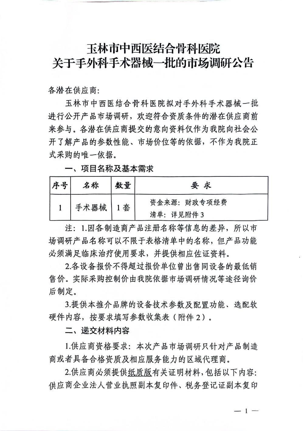 玉林市中西医结合骨科医院关于手外科手术器械一批的市场调研公告