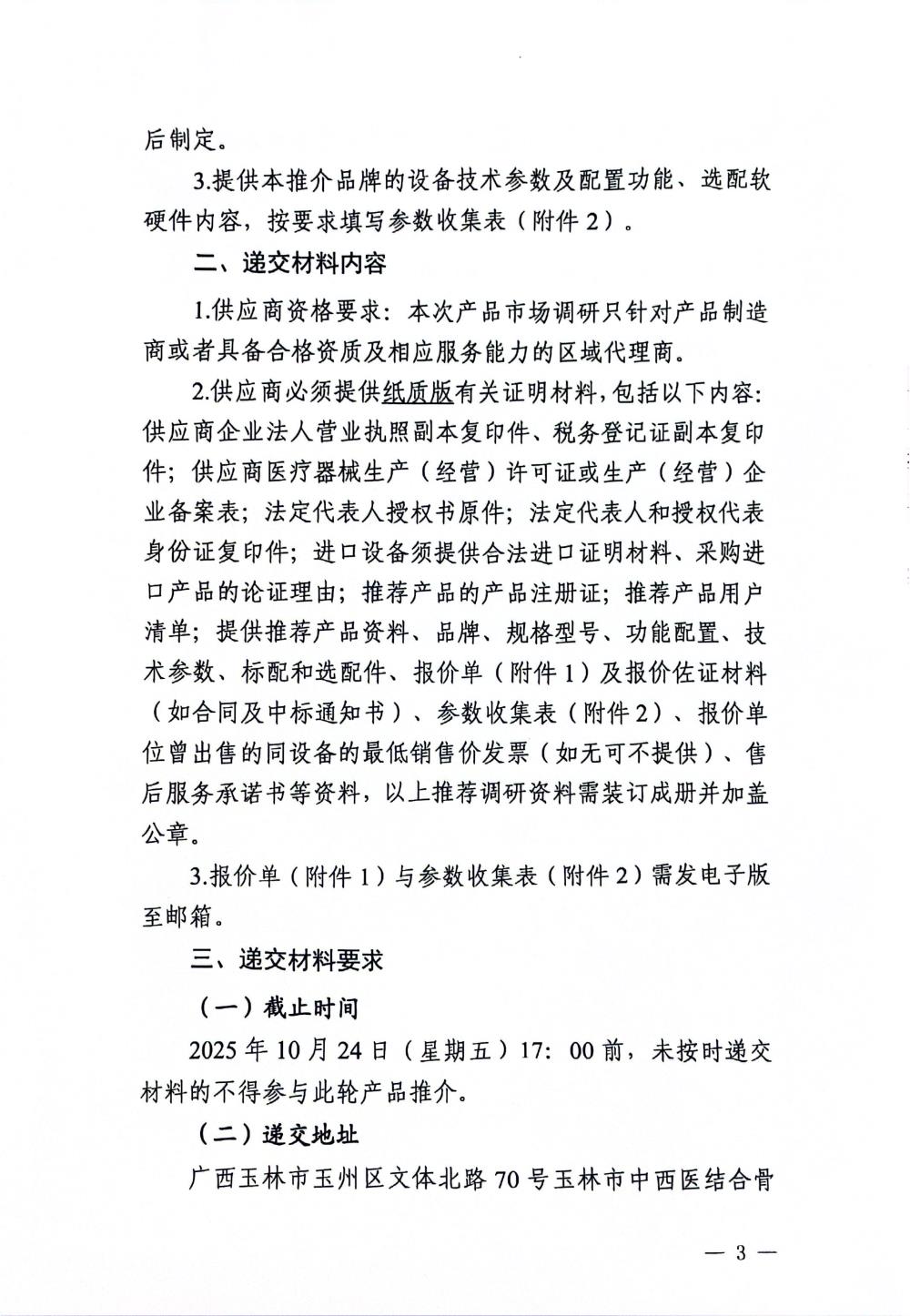 玉林市中西医结合骨科医院关于脊柱椎间孔镜微创手术器械的市场调研公告
