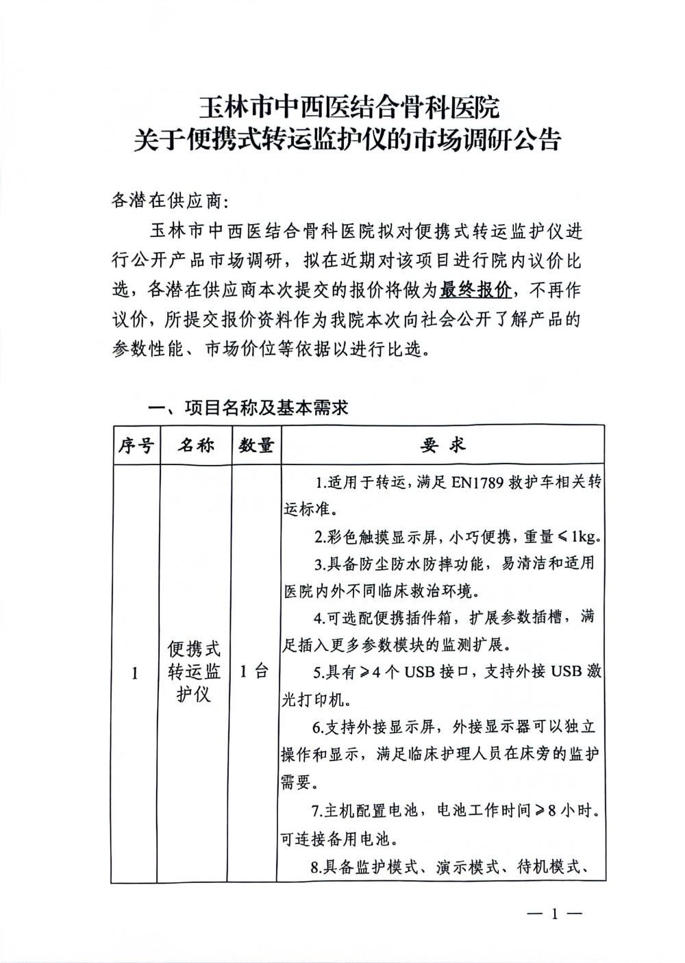 玉林市中西医结合骨科医院关于便携式转运监护仪的市场调研公告