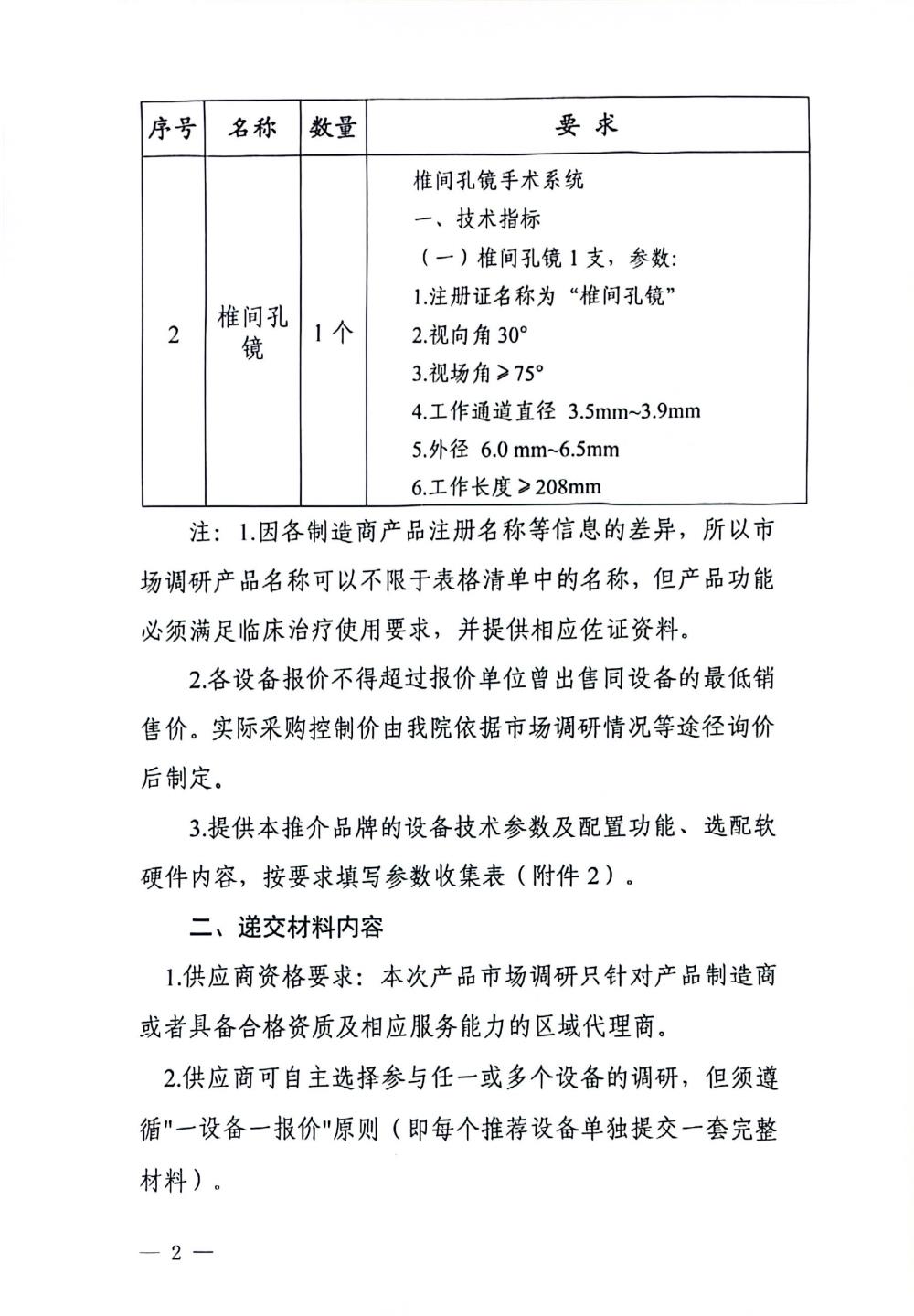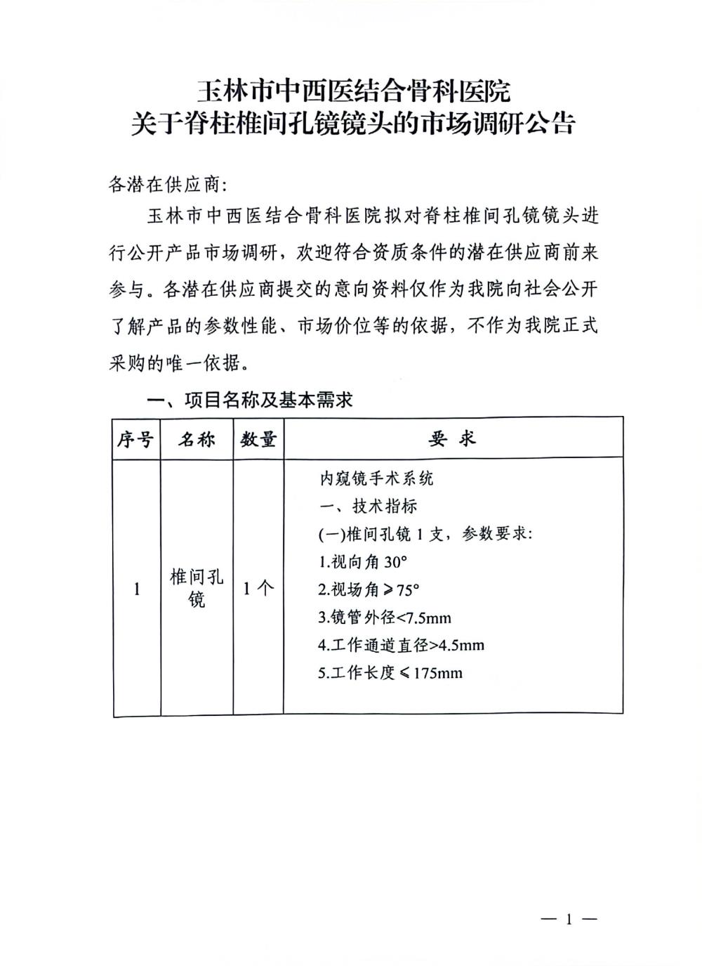 玉林市中西医结合骨科医院关于脊柱椎间孔镜镜头的市场调研公告