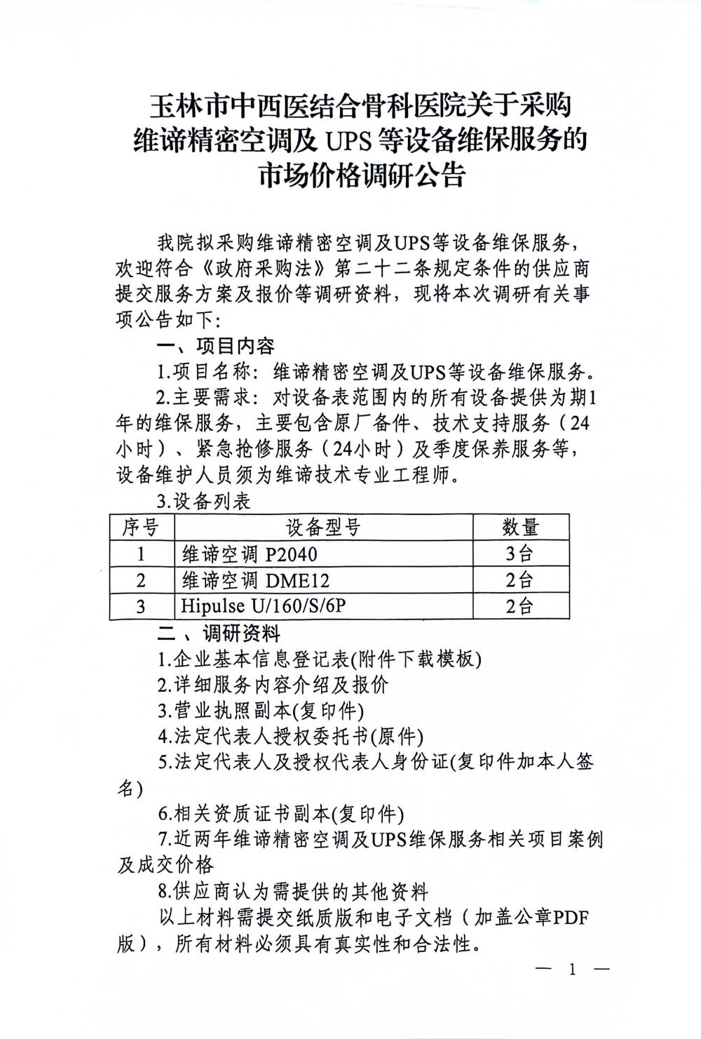 玉林市中西医结合骨科医院关于采购维谛精密空调及UPS等设备维保服务的市场价格调研公告