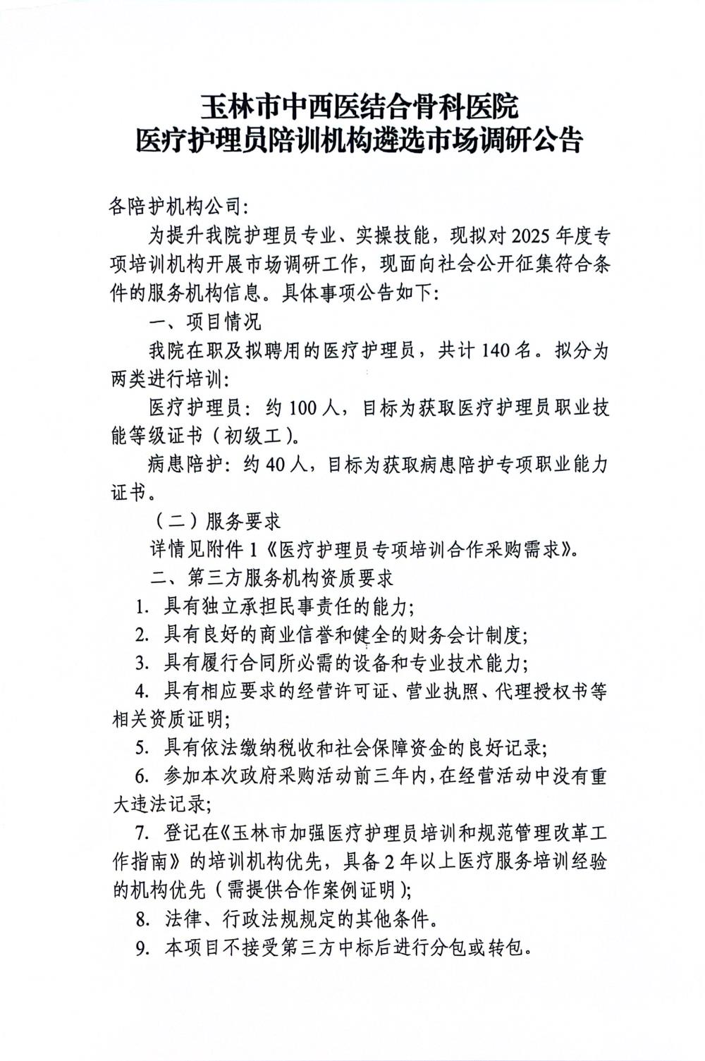 玉林市中西医结合骨科医院医疗护理员陪训机构遴选市场调研公告