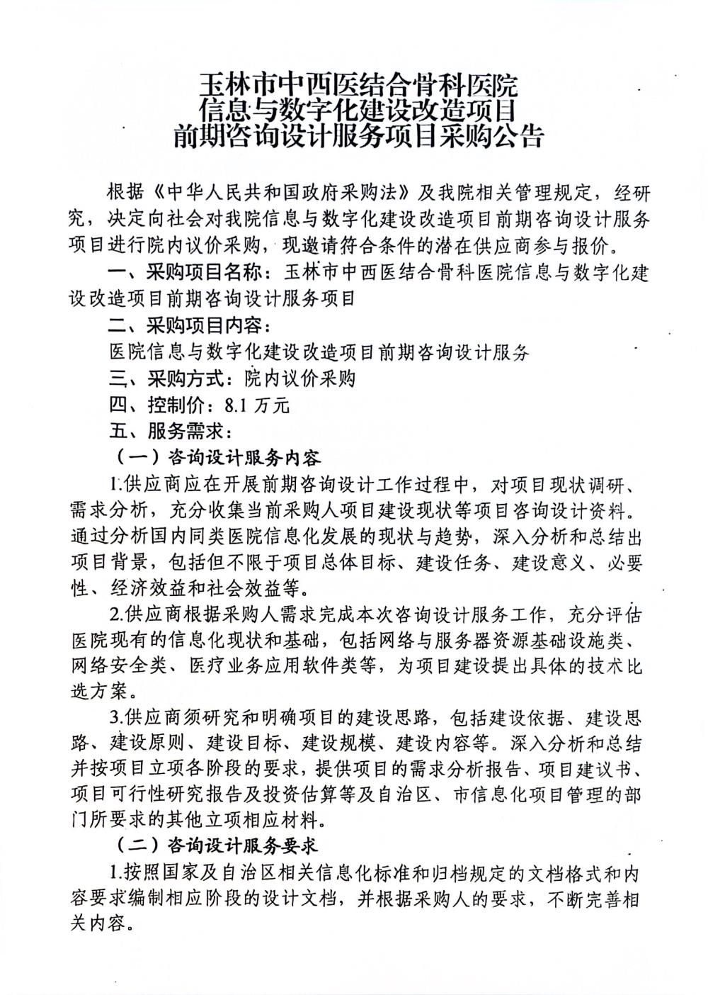 玉林市中西医结合骨科医院信息与数字化建设改造项目前期咨询设计服务项目采购公告
