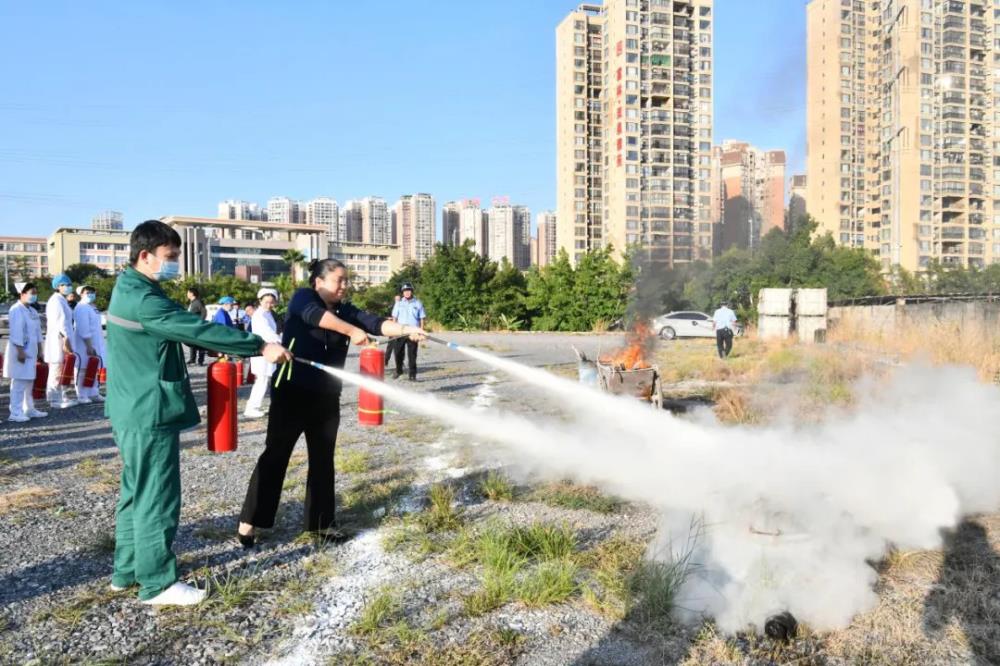 医护人员、行政后勤人员以及第三方服务人员分组上阵,面对油盆火源。大家沉着冷静地按照规范开启灭火器,精准扑灭火焰。