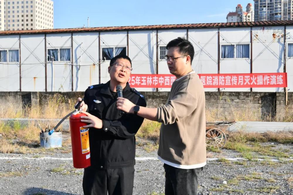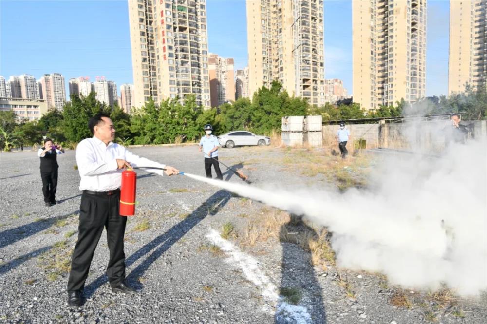 消防灭火实战环节,保卫科科长黎钢讲解灭火器日常检查事项,详细剖析灭火器“提、拔、握、压”四字口诀并进行示范操作。