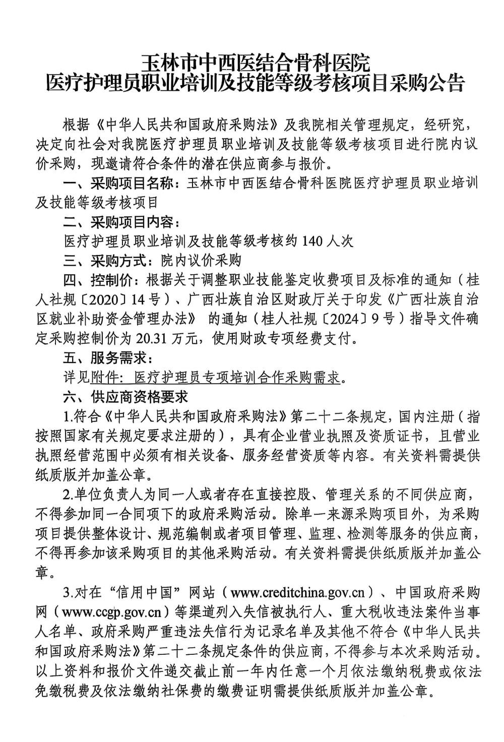 玉林市中西医结合骨科医院医疗护理员职业培训及技能等级考核项目采购公告