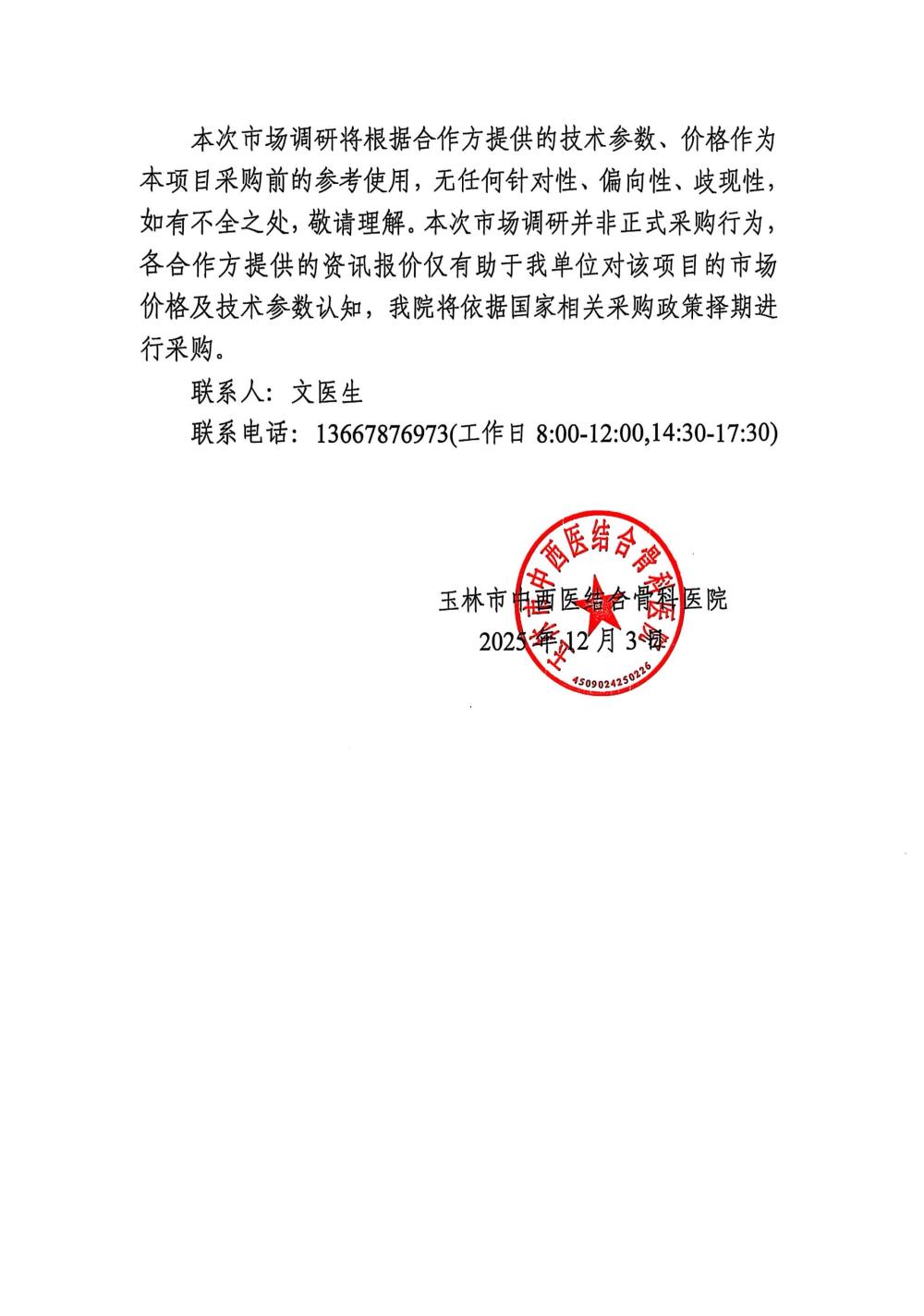 玉林市中西医结合骨科医院关于G型臂X线机球管维保项目市场调研公告