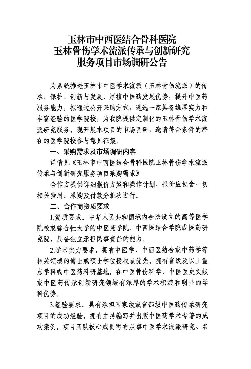 玉林市中西医结合骨科医院玉林骨伤学术流派传承与创新研究服务项目市场调研公告