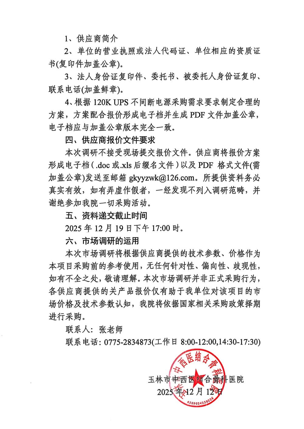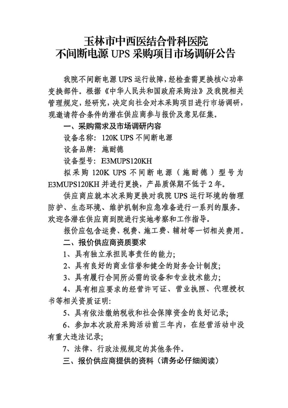 玉林市中西医结合骨科医院不间断电源UPS采购项目市场调研公告