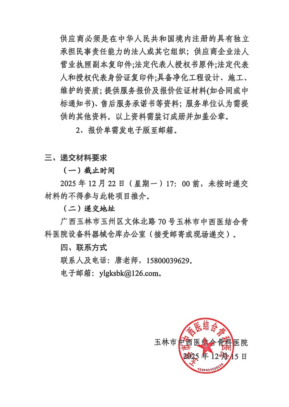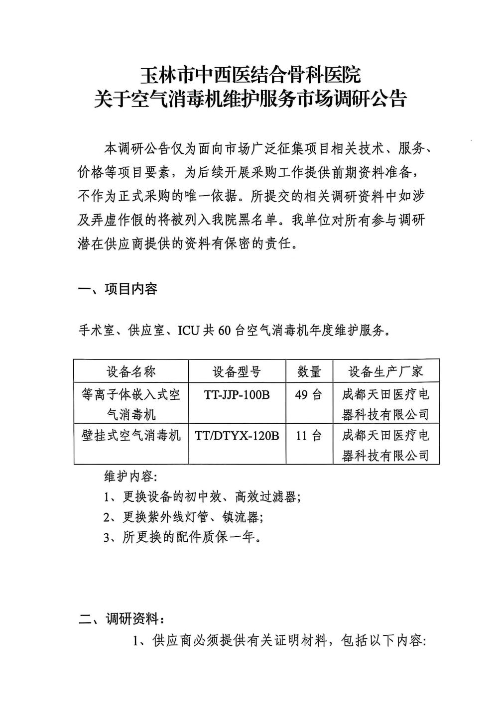 玉林市中西医结合骨科医院关于空气消毒机维护服务市场调研公告