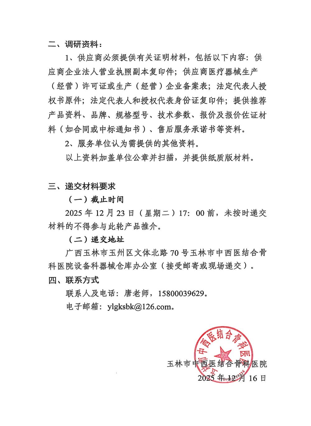 玉林市中西医结合骨科医院关于椎间孔镜维修服务市场调研公告