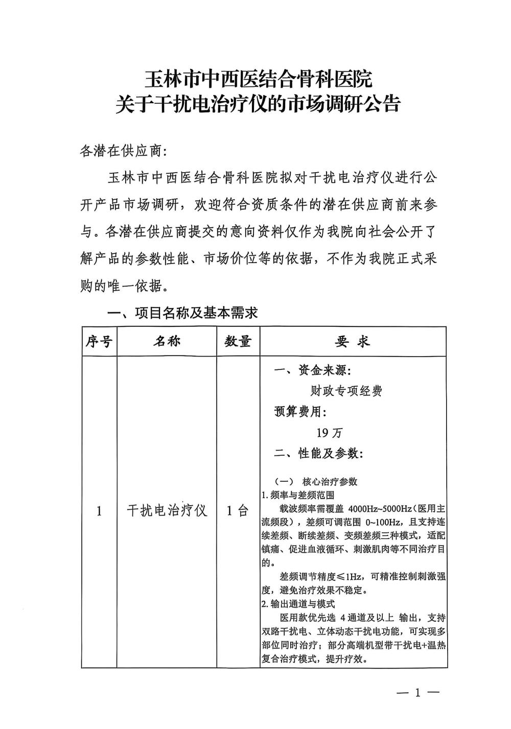 玉林市中西医结合骨科医院关于干扰电治疗仪的市场调研公告