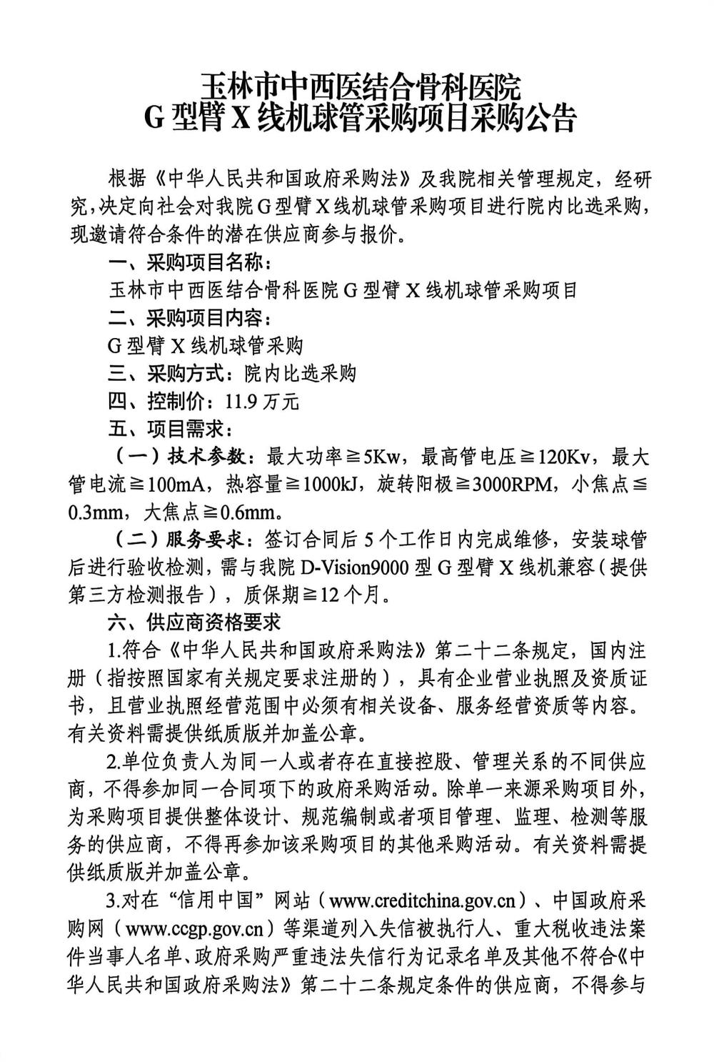 玉林市中西医结合骨科医院G型臂X线机球管采购项目采购公告