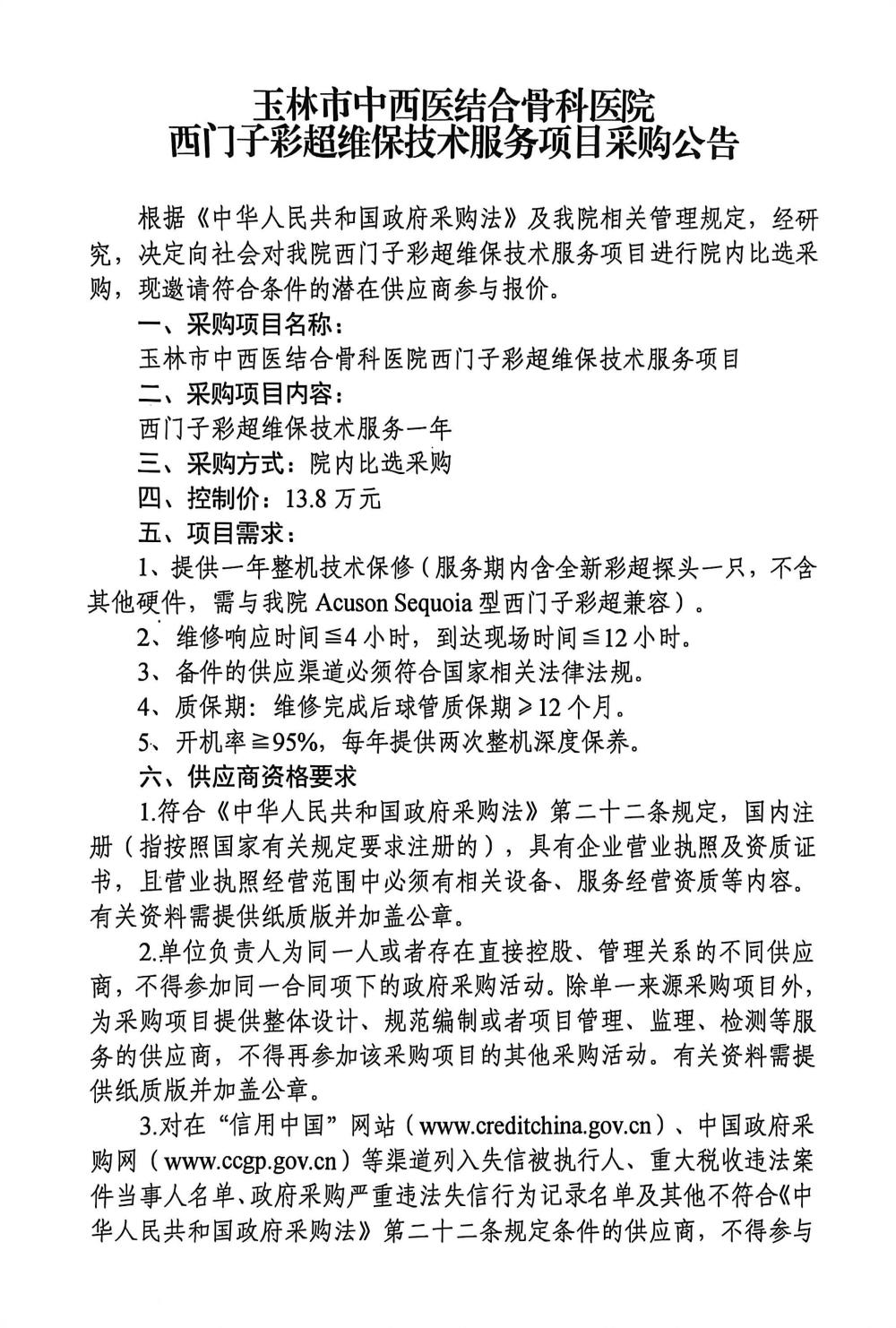 玉林市中西医结合骨科医院西门子彩超维保技术服务项目采购公告