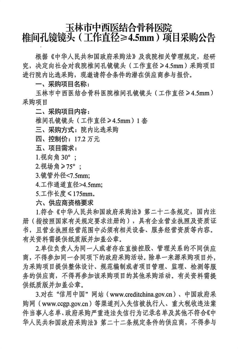 玉林市中西医结合骨科医院椎间孔镜镜头(工作直径<4.0mm)项目采购公告