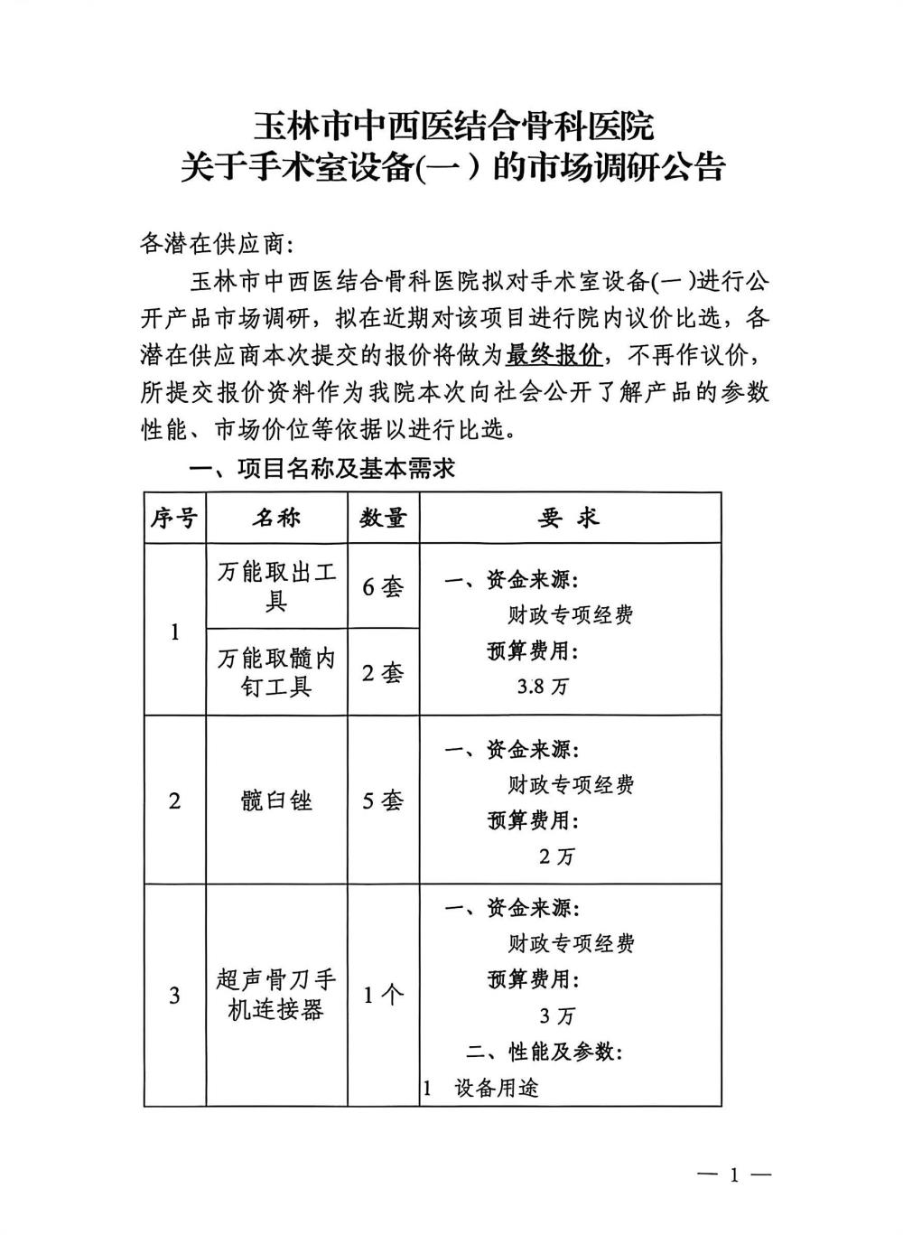 玉林市中西医结合骨科医院关于手术室设备(一)的市场调研公告