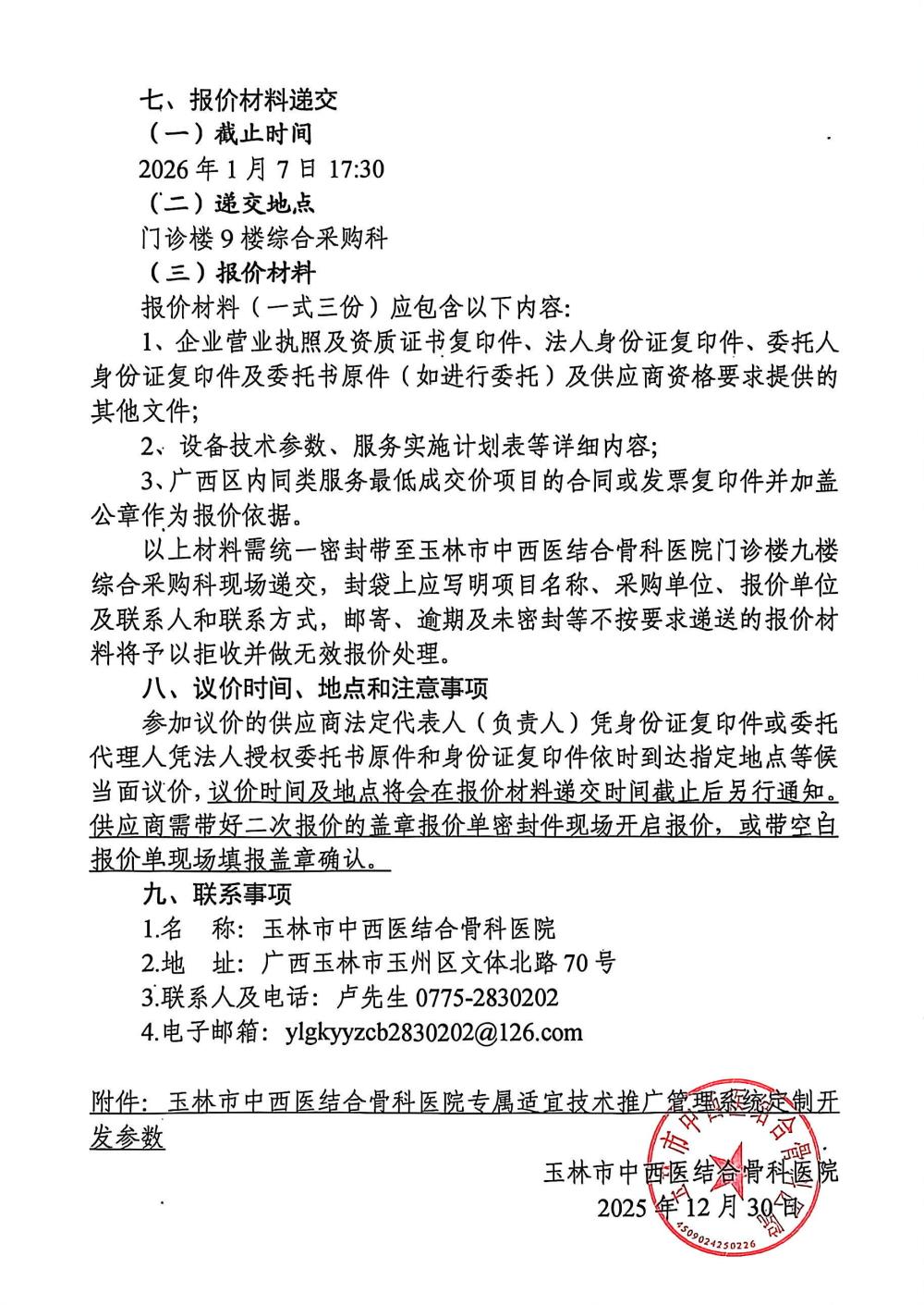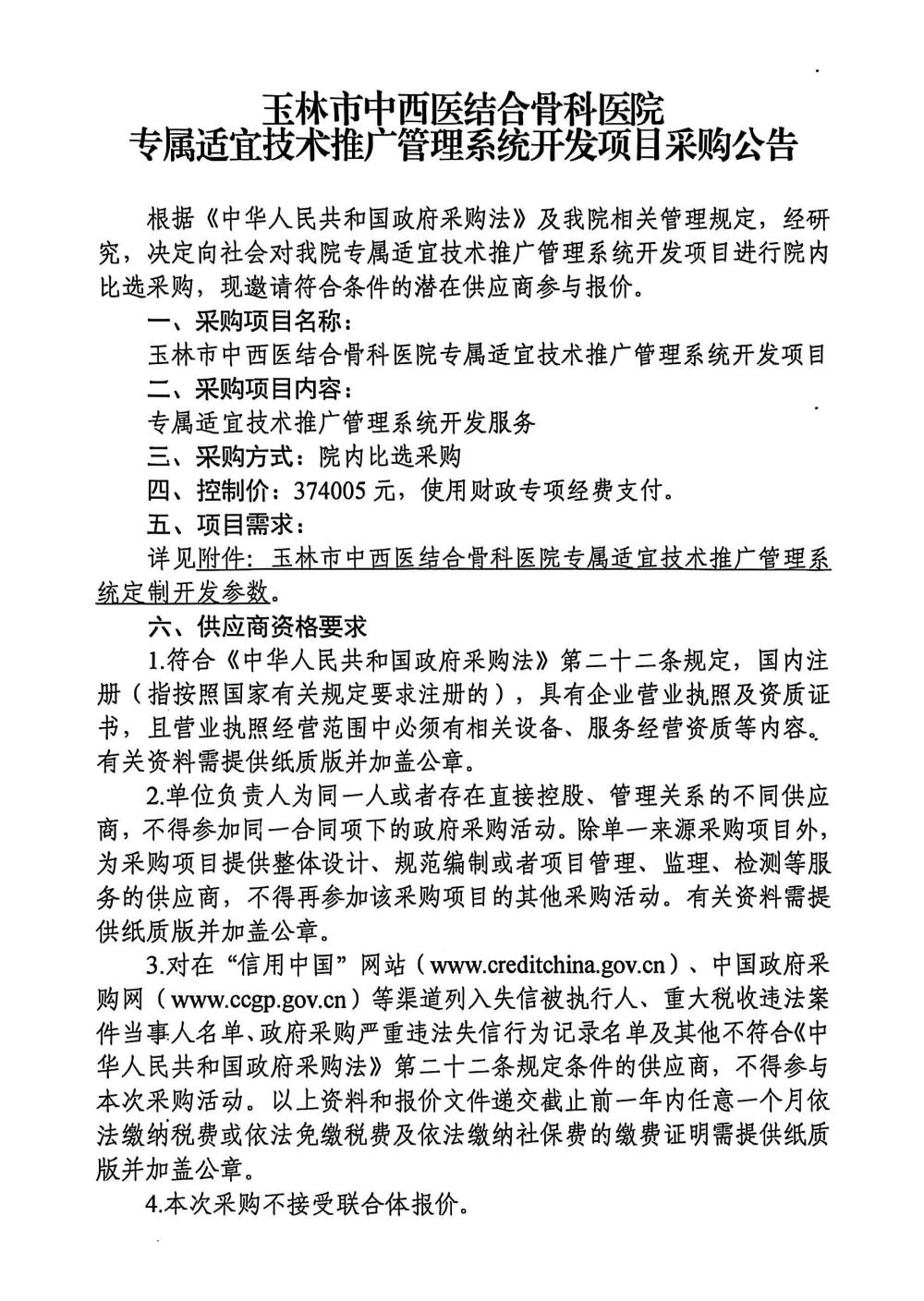 玉林市中西医结合骨科医院专属适宜技术推广管理系统开发项目采购公告