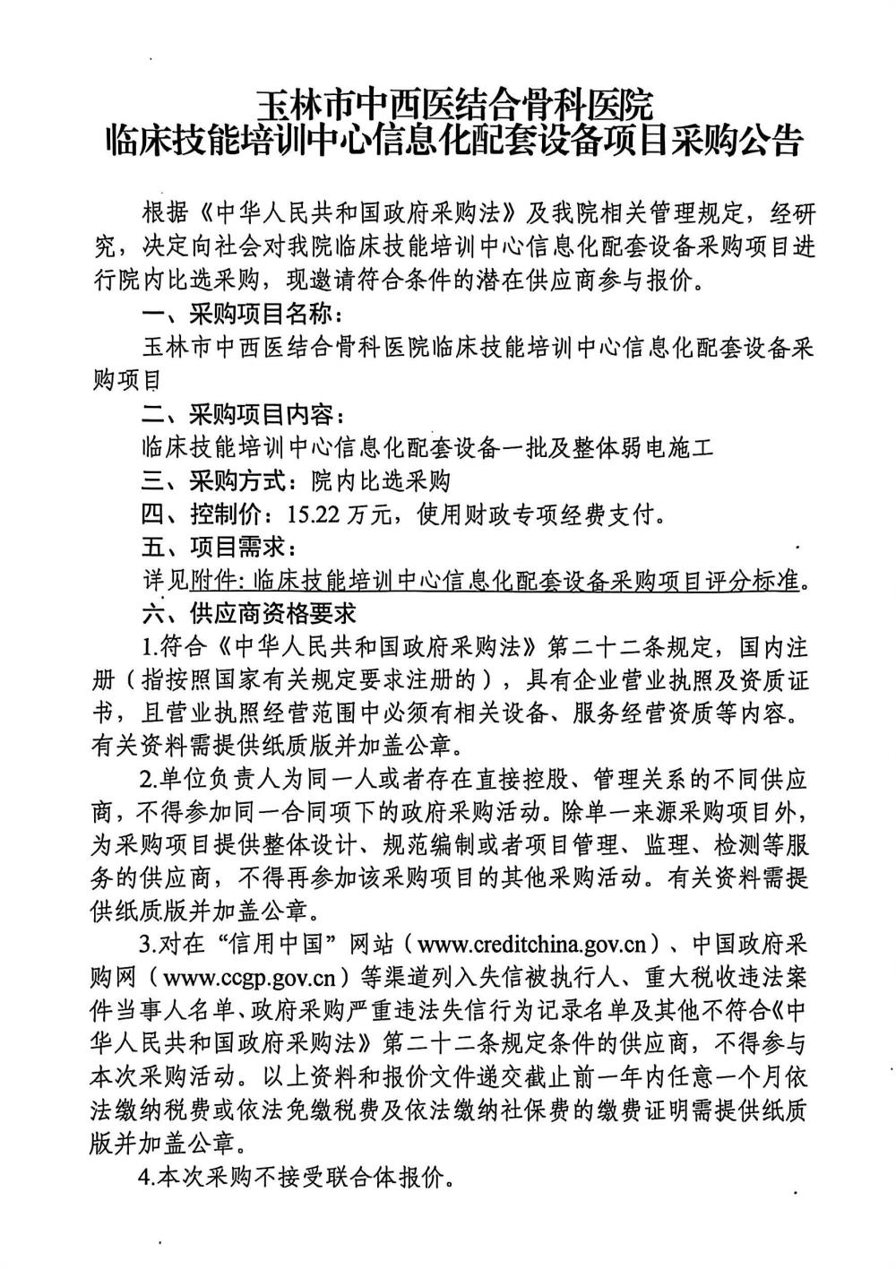 玉林市中西医结合骨科医院临床技能培训中心信息化配套设备项目采购公告