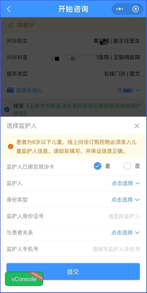 ③选择咨询人,点击接受《玉林市中西医结合骨科医院互联网医院咨询用户协议》,点击【下一步】