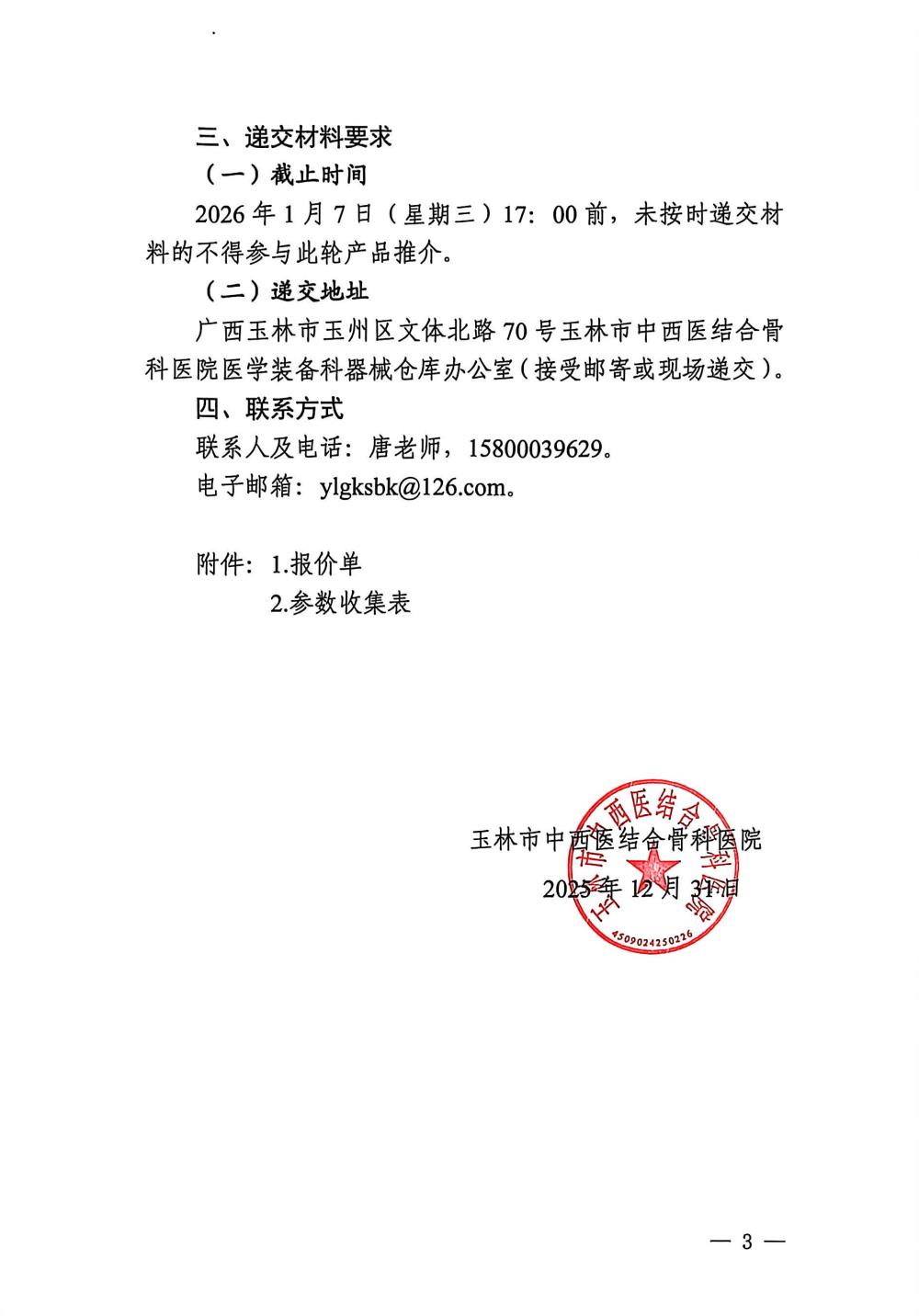 玉林市中西医结合骨科医院关于骨动力刨削手术系统和UBE镜头的市场调研公告