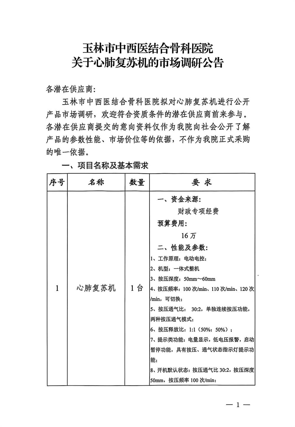 玉林市中西医结合骨科医院关于心肺复苏机的市场调研公告