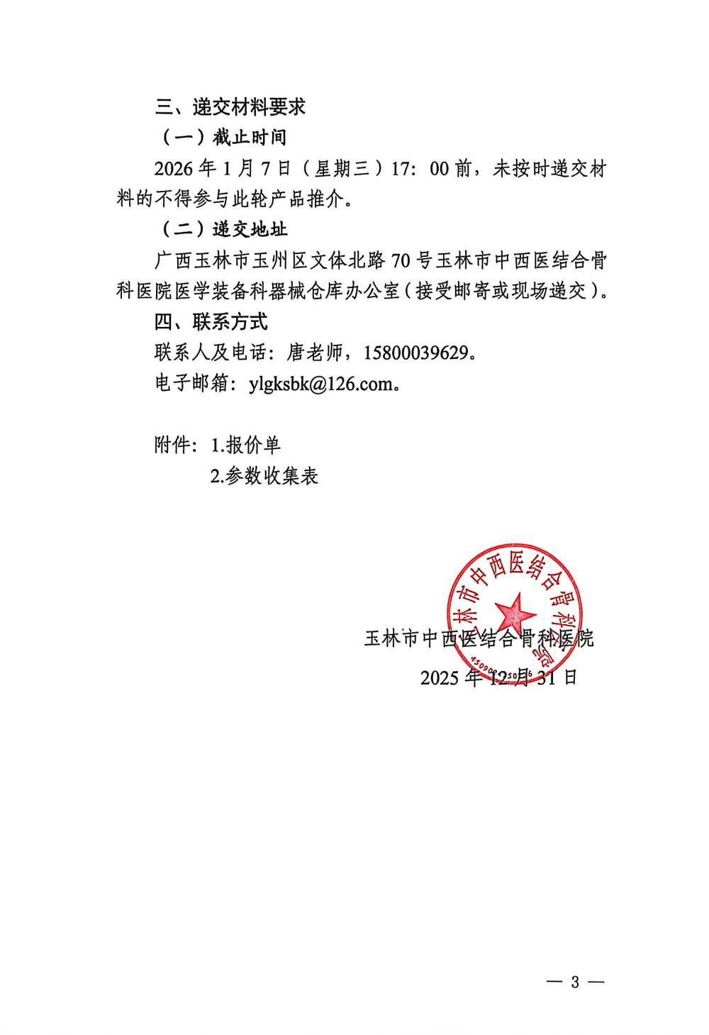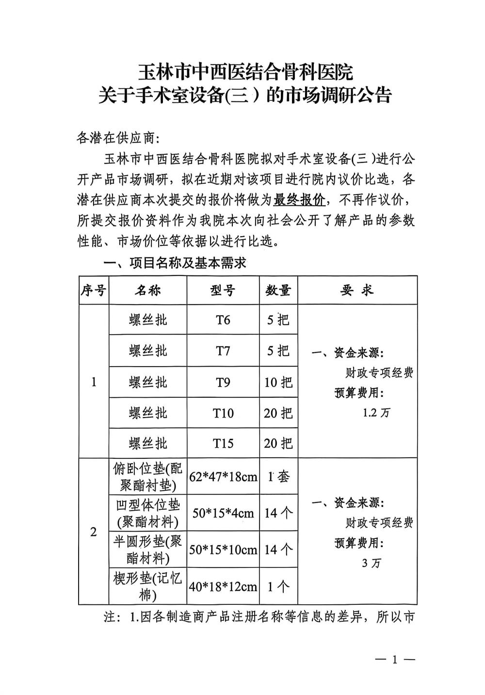 玉林市中西医结合骨科医院关于手术室设备(三)的市场调研公告