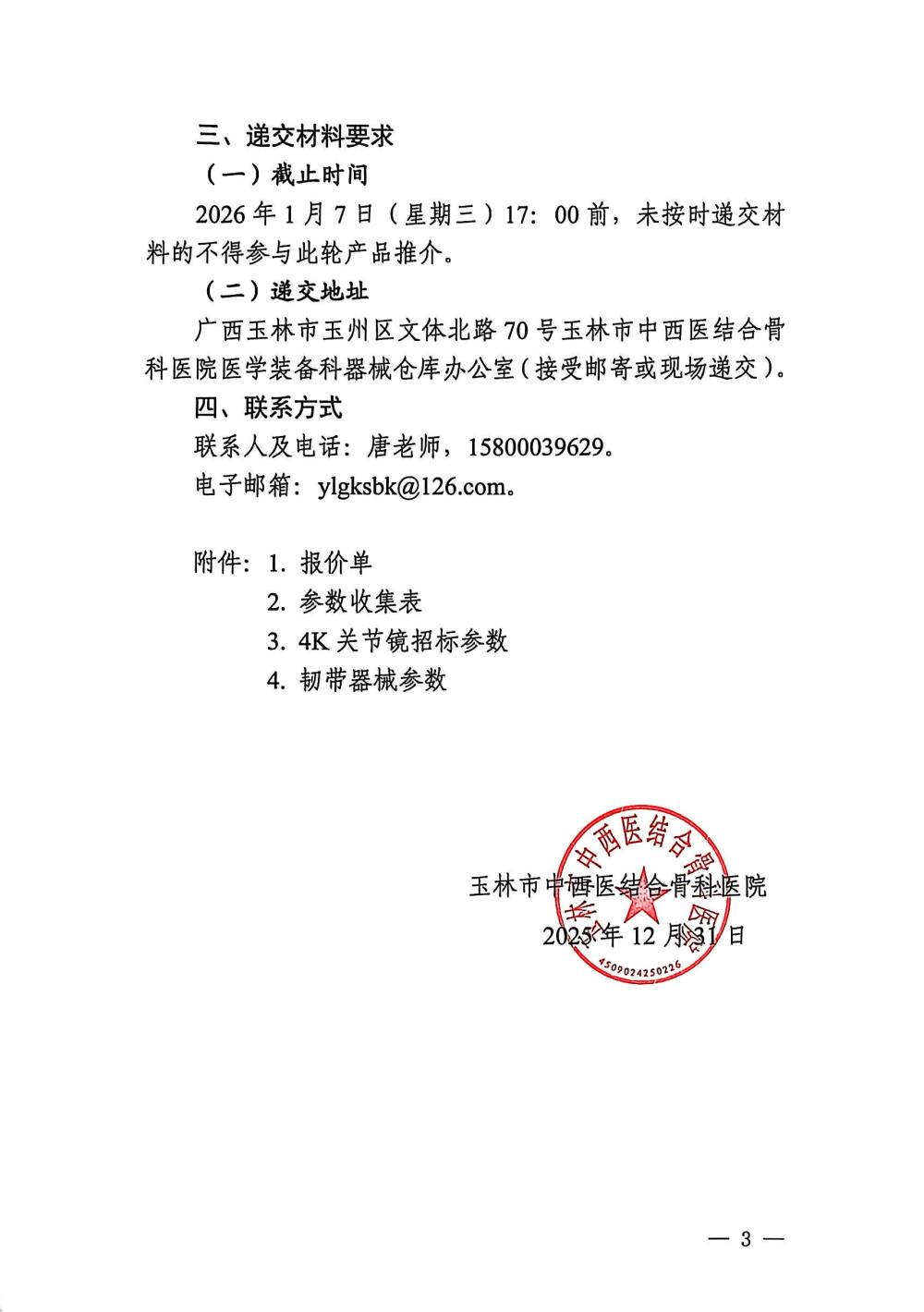 玉林市中西医结合骨科医院关于高清关节镜摄像系统与韧带重建工具的市场调研公告